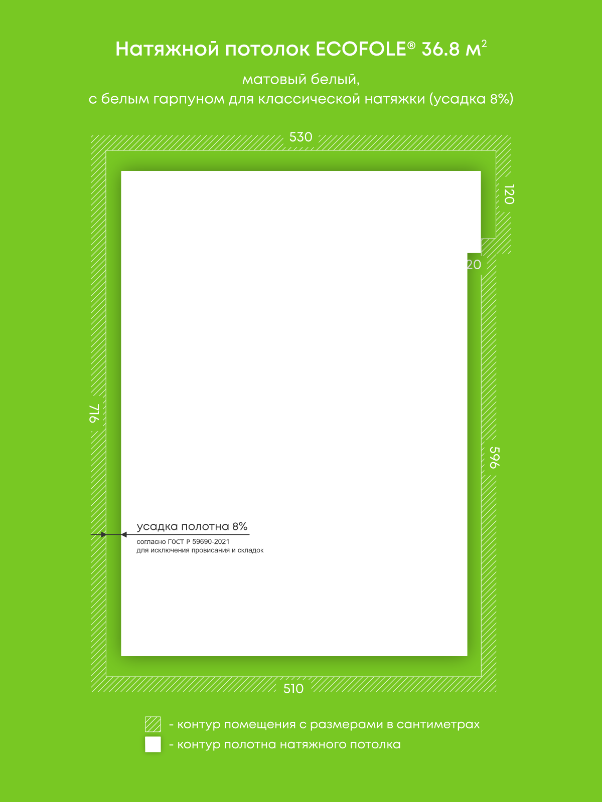 Натяжной потолок белый матовый, изготовленный по индивидуальным размерам покупателя, для кухни площадью 36.8 м2