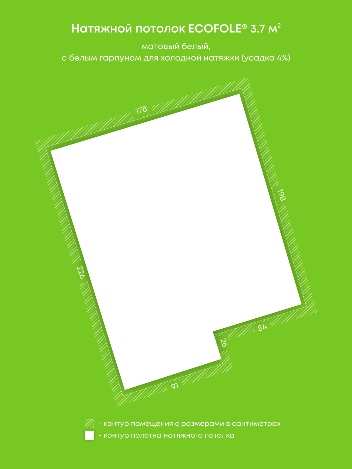 Натяжной потолок белый матовый, изготовленный по индивидуальным размерам покупателя, для ванной площадью 3.7 м2