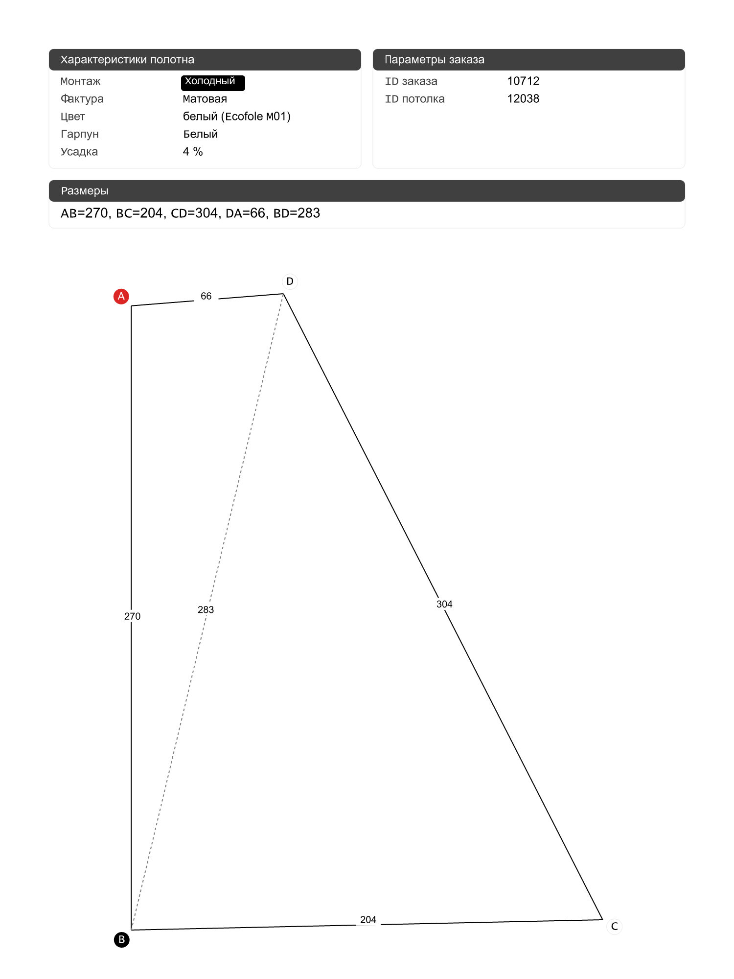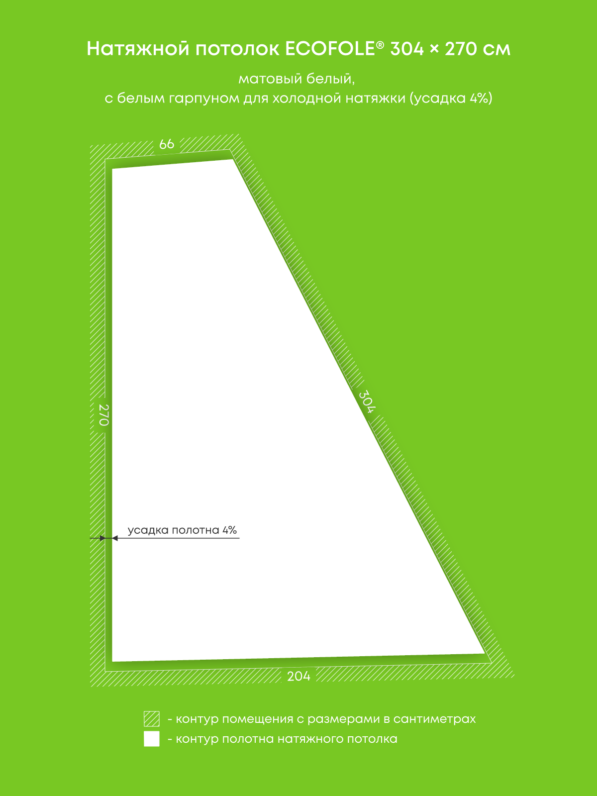 Натяжной потолок белый матовый, холодной натяжки, изготовленный по индивидуальным размерам покупателя, для помещения площадью 3.7 м2