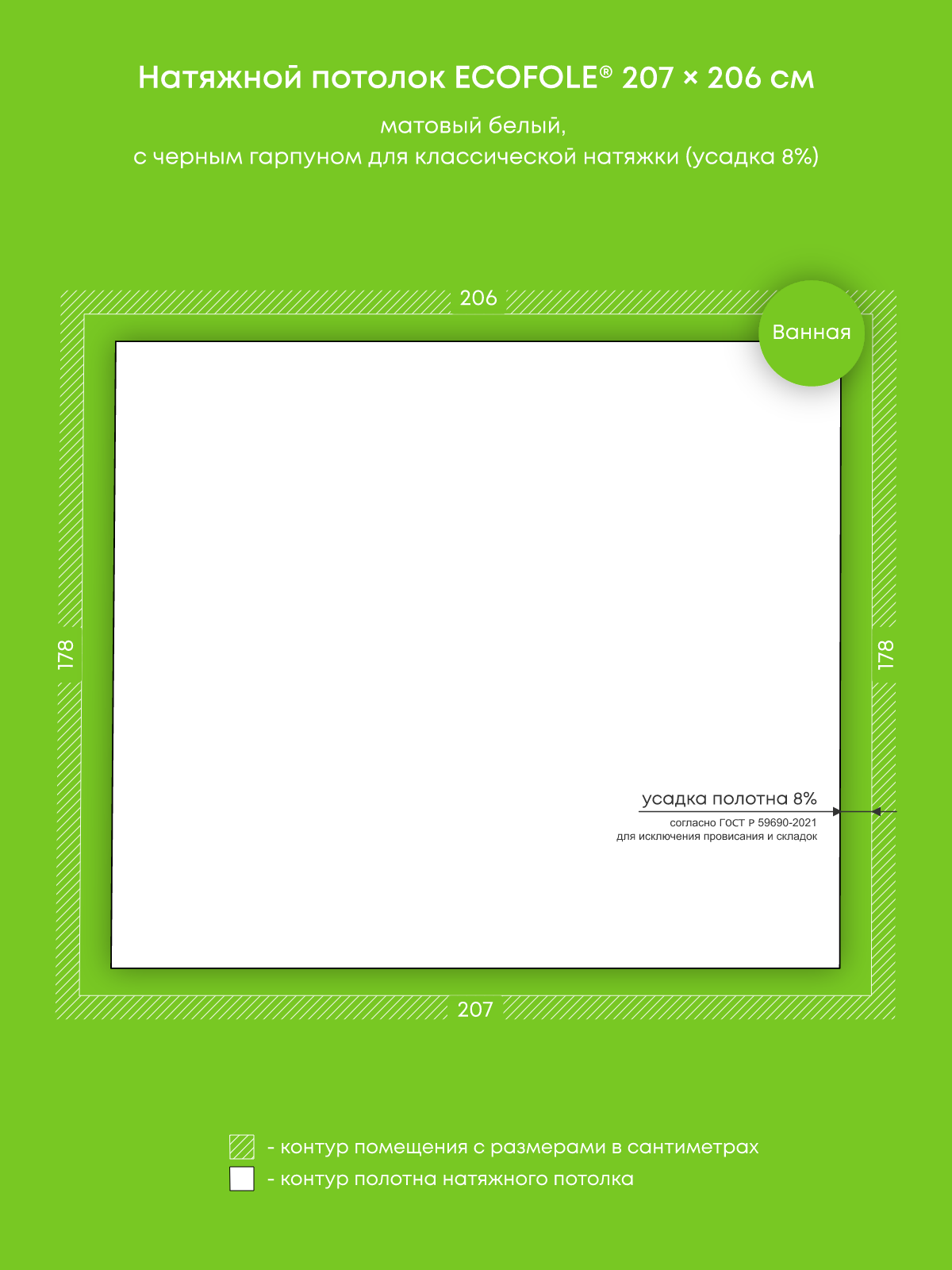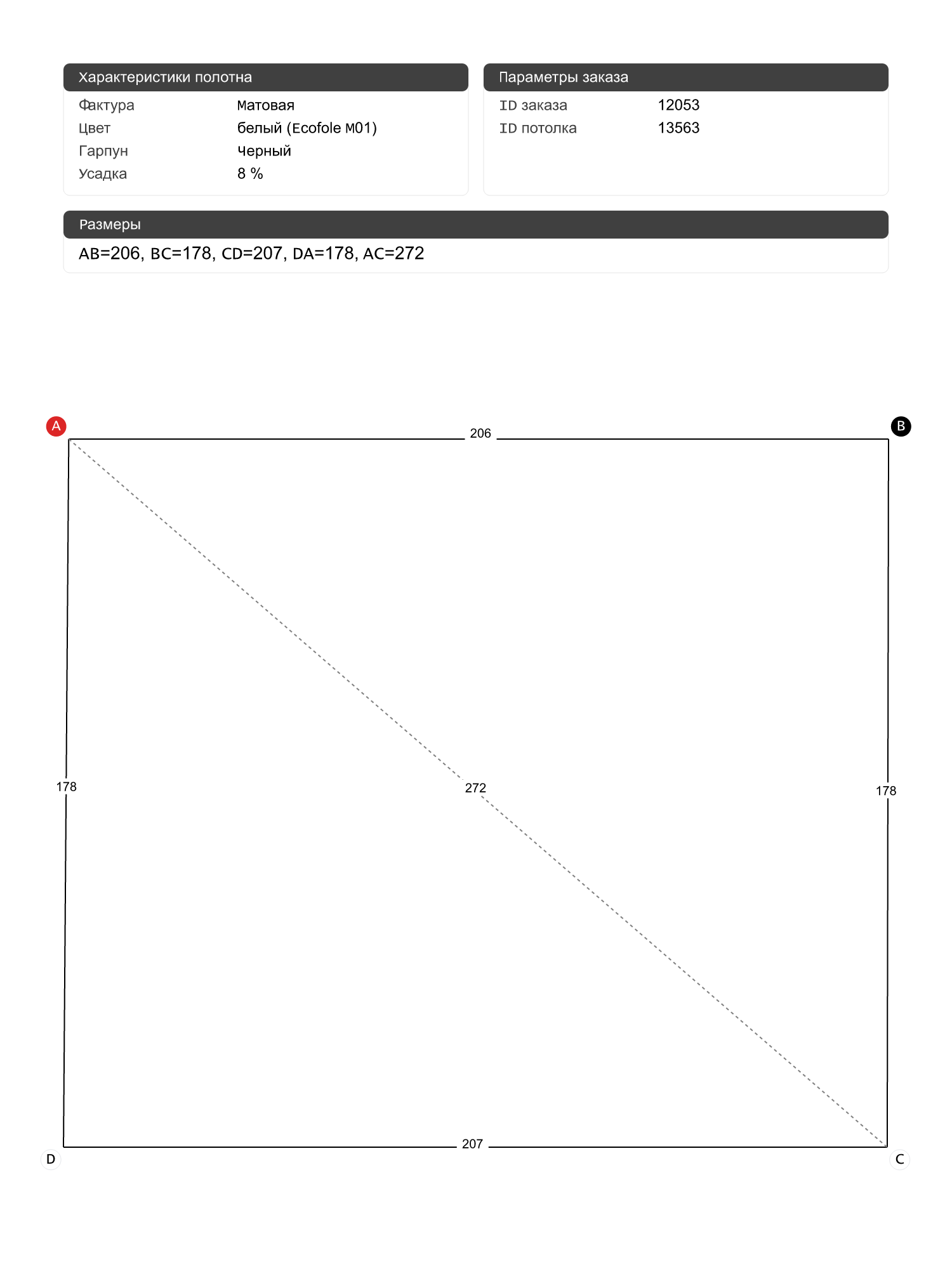 Натяжной потолок белый матовый с черным гарпуном, классической натяжки, изготовленный по индивидуальным размерам покупателя, для помещения площадью 3.7 м2