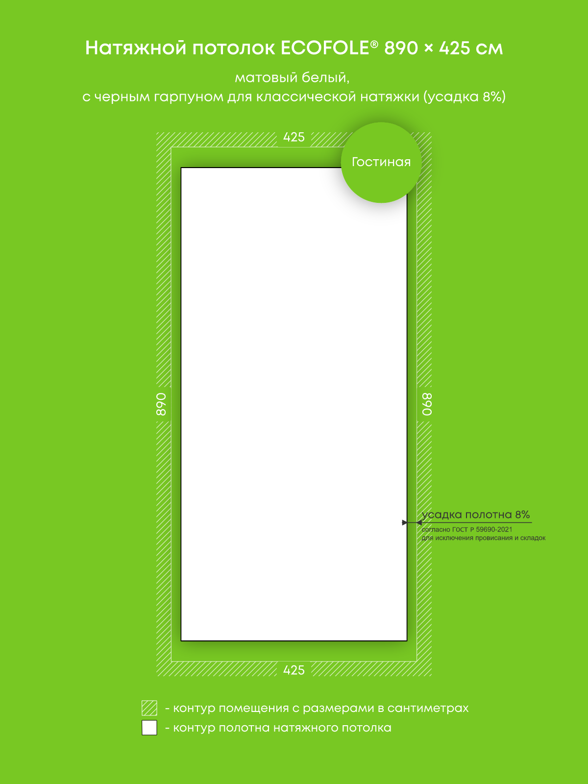Натяжной потолок белый матовый, изготовленный по индивидуальным размерам покупателя, для гостиной площадью 37.8 м2