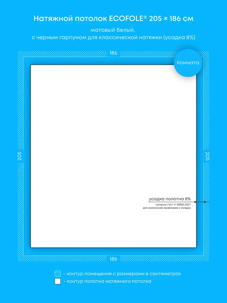 - Технология производства натяжного потолка предусматривает его усадку на 4-9% для исключения провисания после монтажа, т.е. фактический размер готового потолка составляет на 4-9% меньше исходного размера помещения и не является браком;