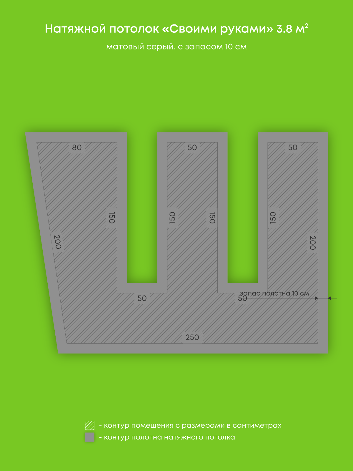 Натяжной потолок серый матовый, изготовленный по индивидуальным размерам покупателя, для кухни площадью 3.8 м2