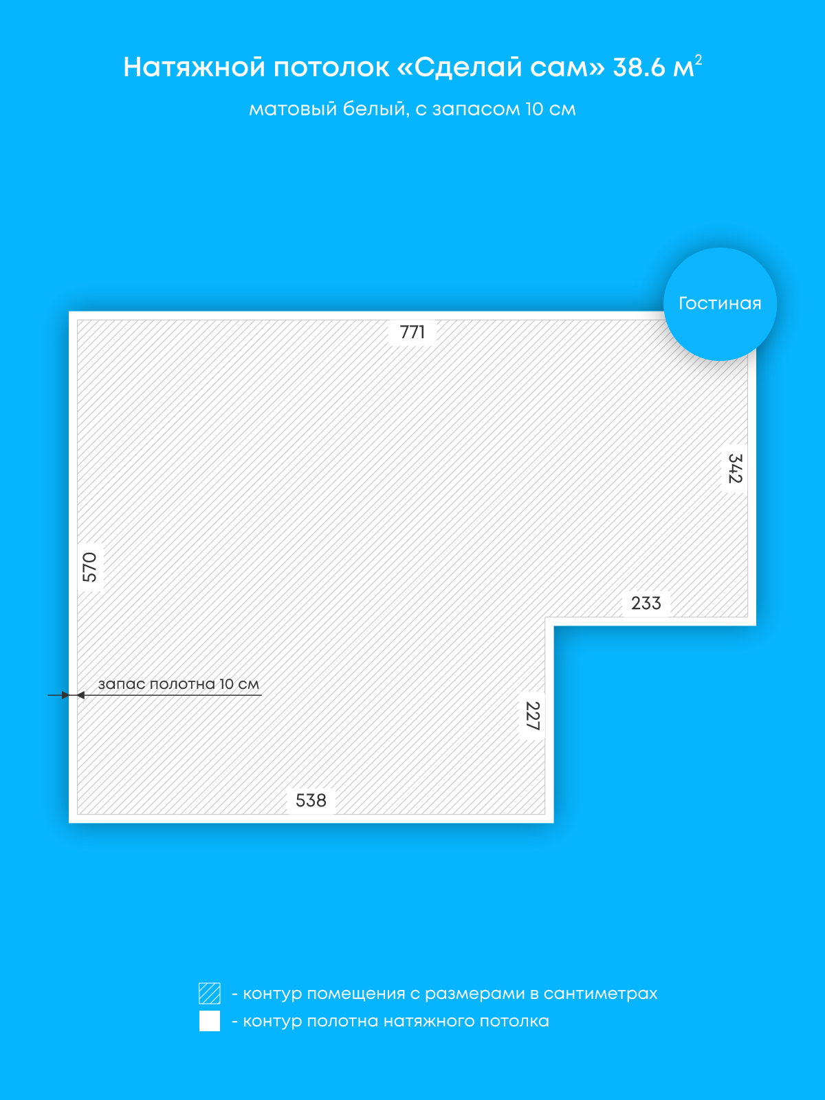 Натяжной потолок белый матовый, изготовленный по индивидуальным размерам покупателя, для гостиной площадью 38.6 м2