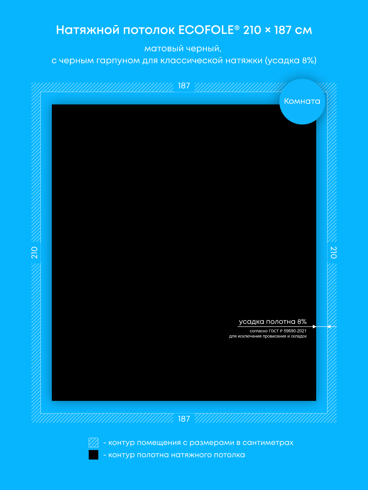 Натяжной потолок черный матовый с черным гарпуном, классической натяжки, изготовленный по индивидуальным размерам покупателя, для помещения площадью 3.9 м2