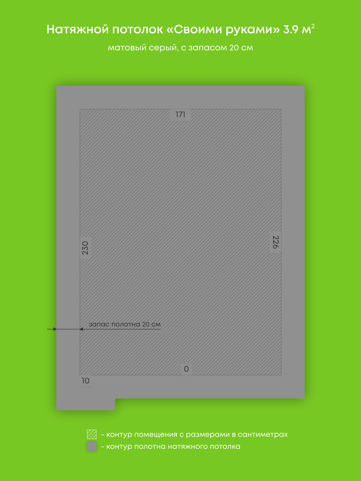 Натяжной потолок серый матовый, изготовленный по индивидуальным размерам покупателя, для помещения площадью 3.9 м2