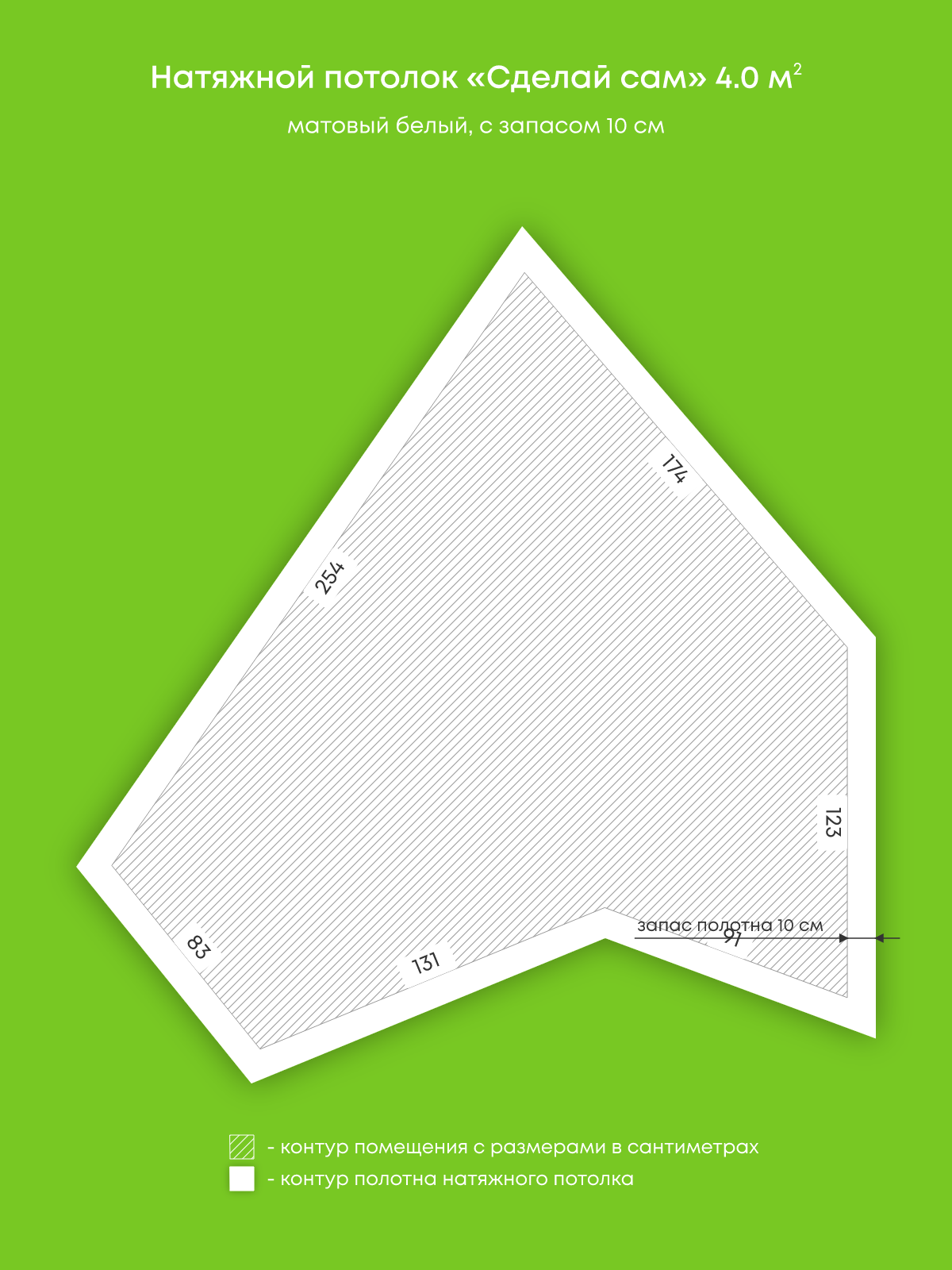 Натяжной потолок белый матовый, изготовленный по индивидуальным размерам покупателя, для гостиной площадью 4 м2