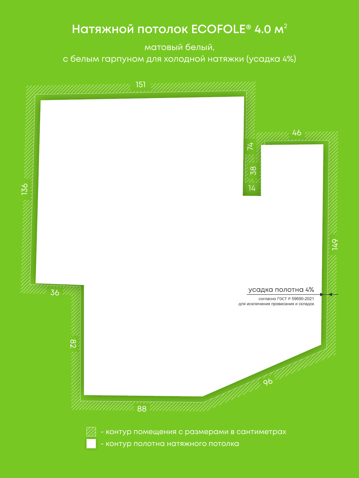 Натяжной потолок белый матовый, изготовленный по индивидуальным размерам покупателя, для помещения площадью 4 м2