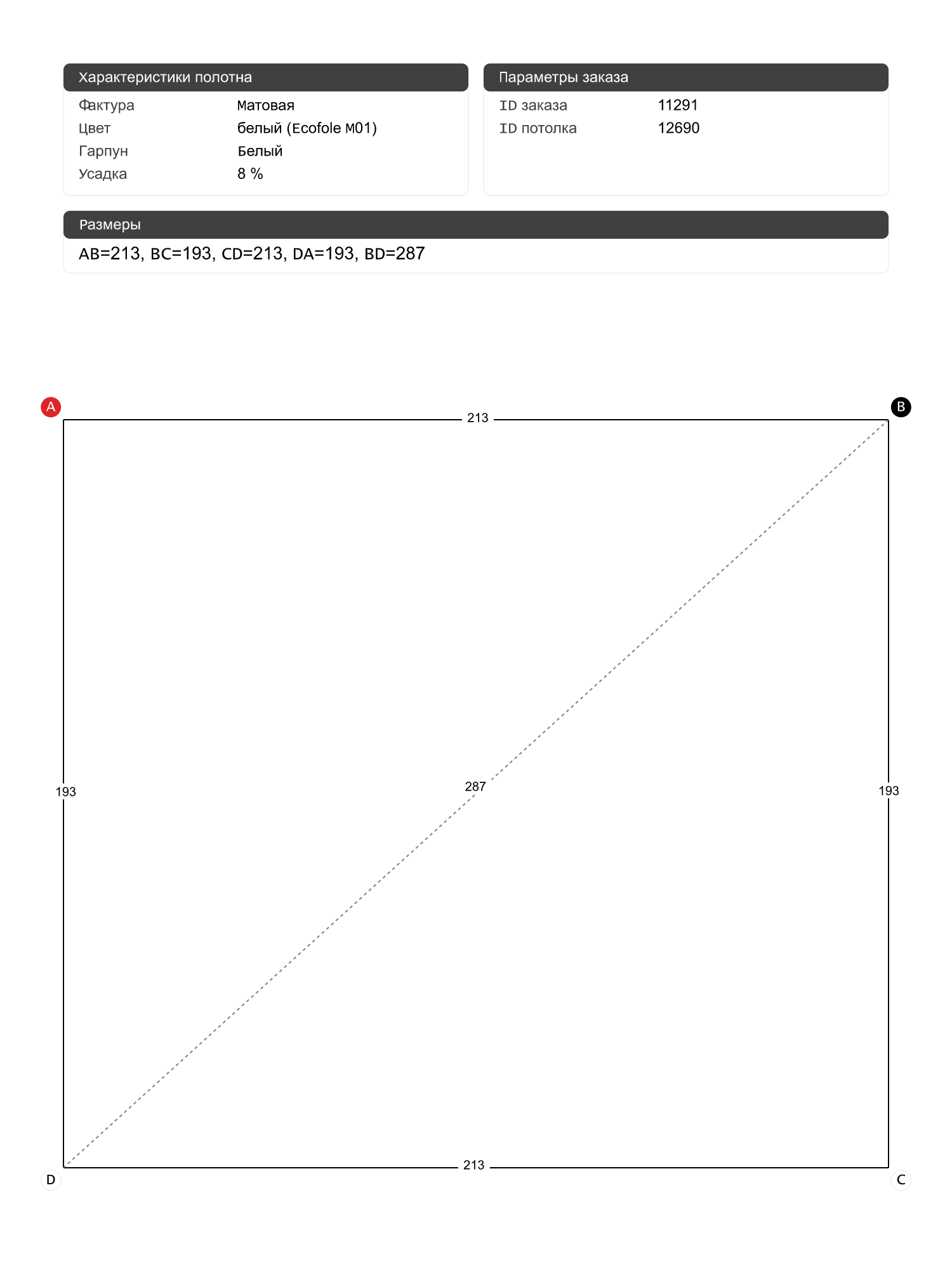 Натяжной потолок белый матовый, классической натяжки, изготовленный по индивидуальным размерам покупателя, для помещения площадью 4.1 м2