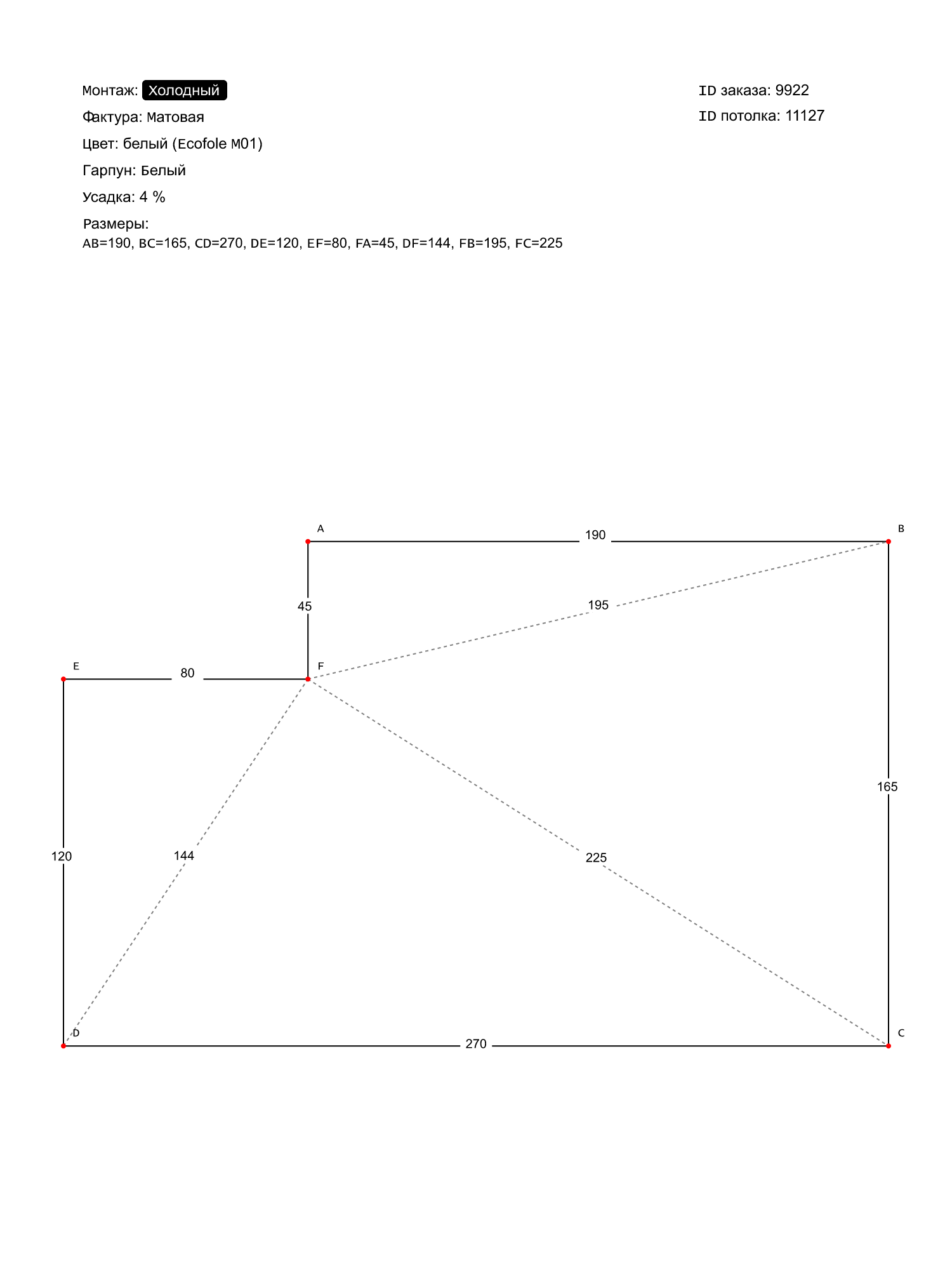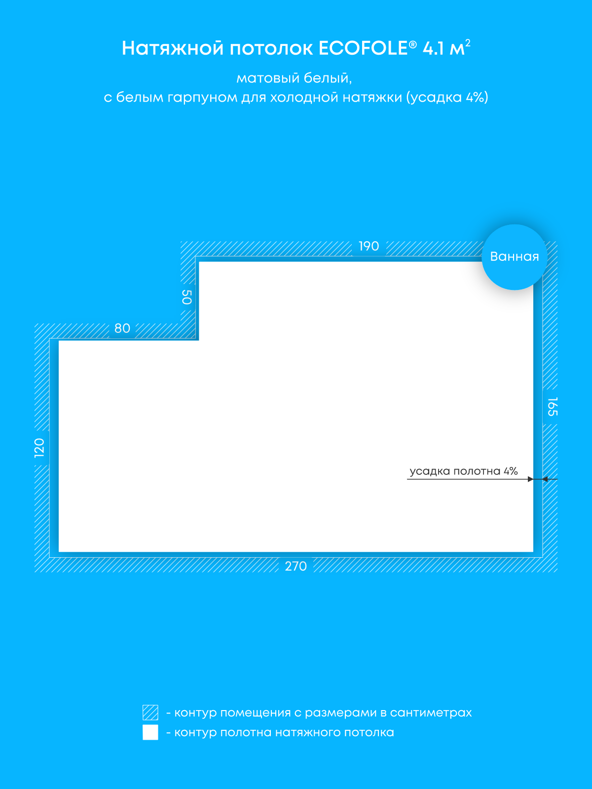Натяжной потолок белый матовый, холодной натяжки, изготовленный по индивидуальным размерам покупателя, для помещения площадью 4.1 м2