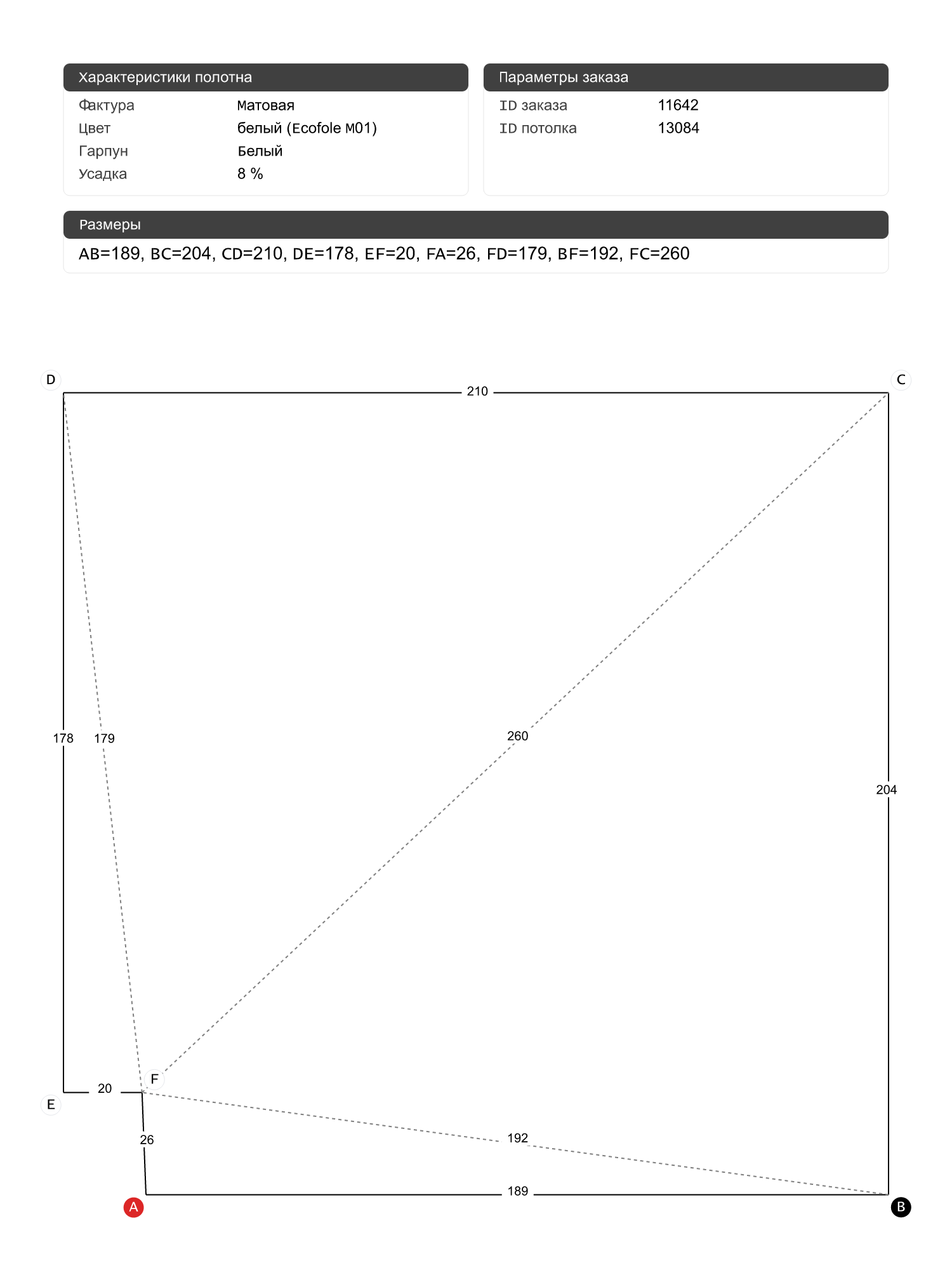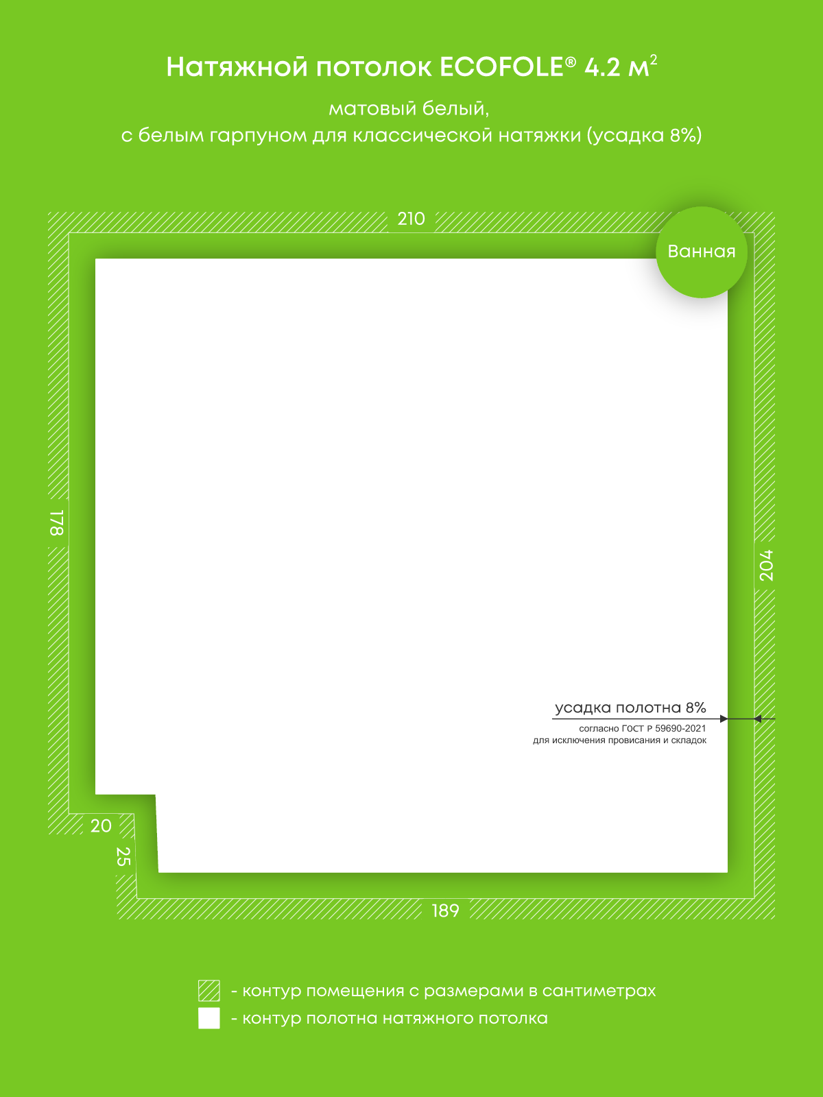 Натяжной потолок белый матовый, классической натяжки, изготовленный по индивидуальным размерам покупателя, для помещения площадью 4.2 м2