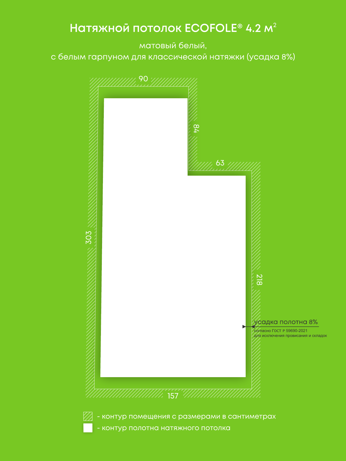 Натяжной потолок белый матовый, изготовленный по индивидуальным размерам покупателя, для помещения площадью 4.2 м2