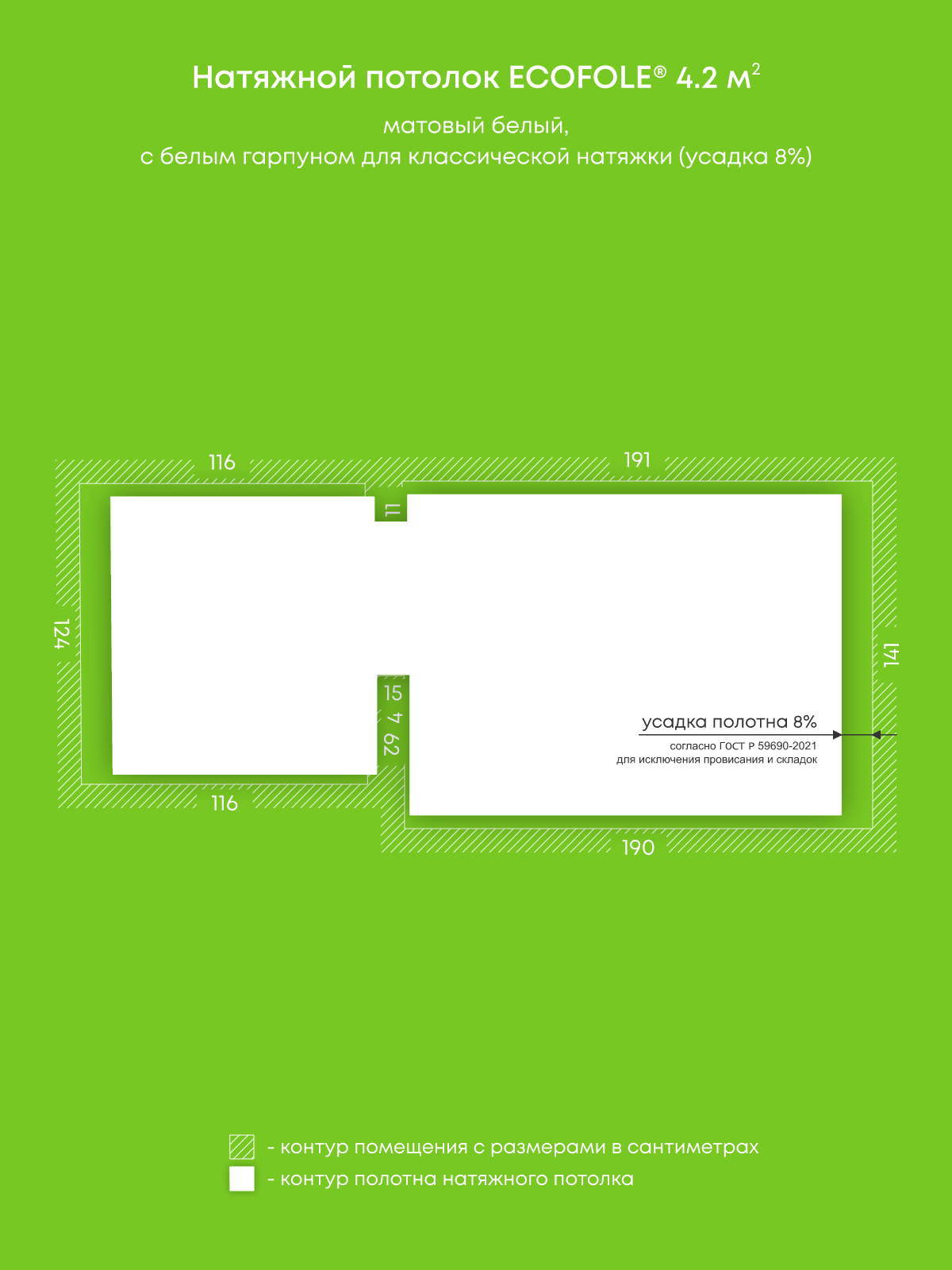 Натяжной потолок белый матовый, изготовленный по индивидуальным размерам покупателя, для ванной площадью 4.2 м2