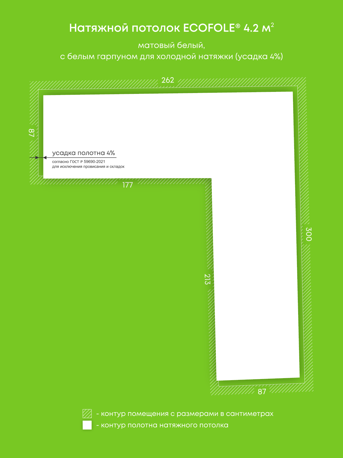 Натяжной потолок белый матовый, изготовленный по индивидуальным размерам покупателя, для помещения площадью 4.2 м2
