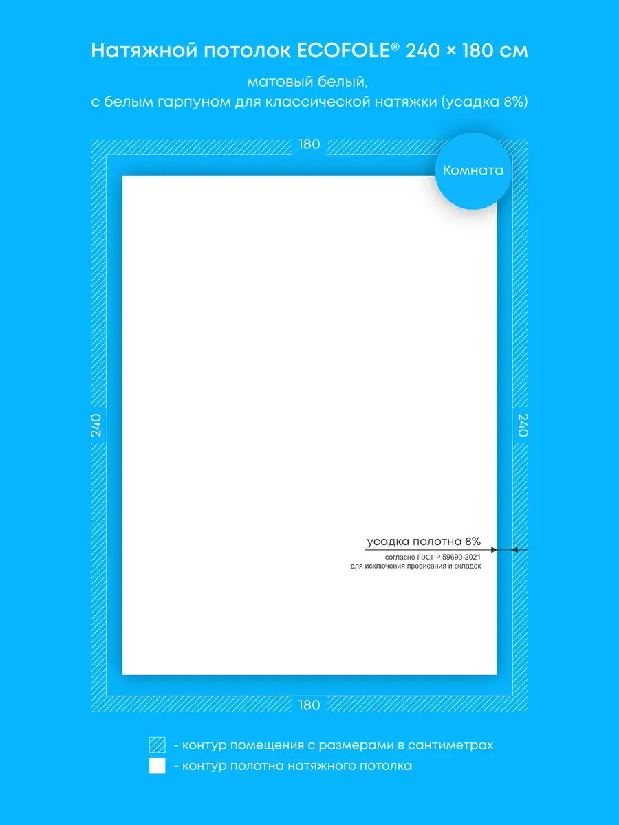 - Технология производства натяжного потолка предусматривает его усадку на 4-9% для исключения провисания после монтажа, т.е. фактический размер готового потолка составляет на 4-9% меньше исходного размера помещения и не является браком;