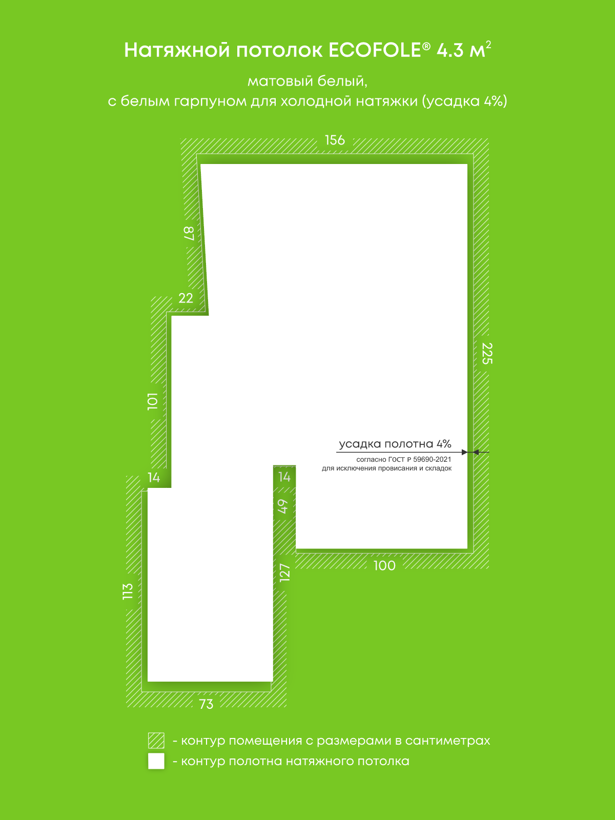 Натяжной потолок белый матовый, изготовленный по индивидуальным размерам покупателя, для комнаты площадью 4.3 м2
