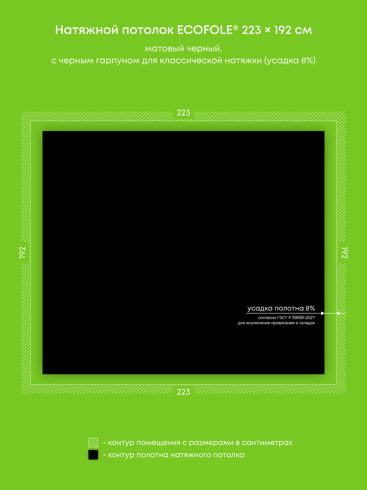 Натяжной потолок черный матовый, изготовленный по индивидуальным размерам покупателя, для помещения площадью 4.3 м2