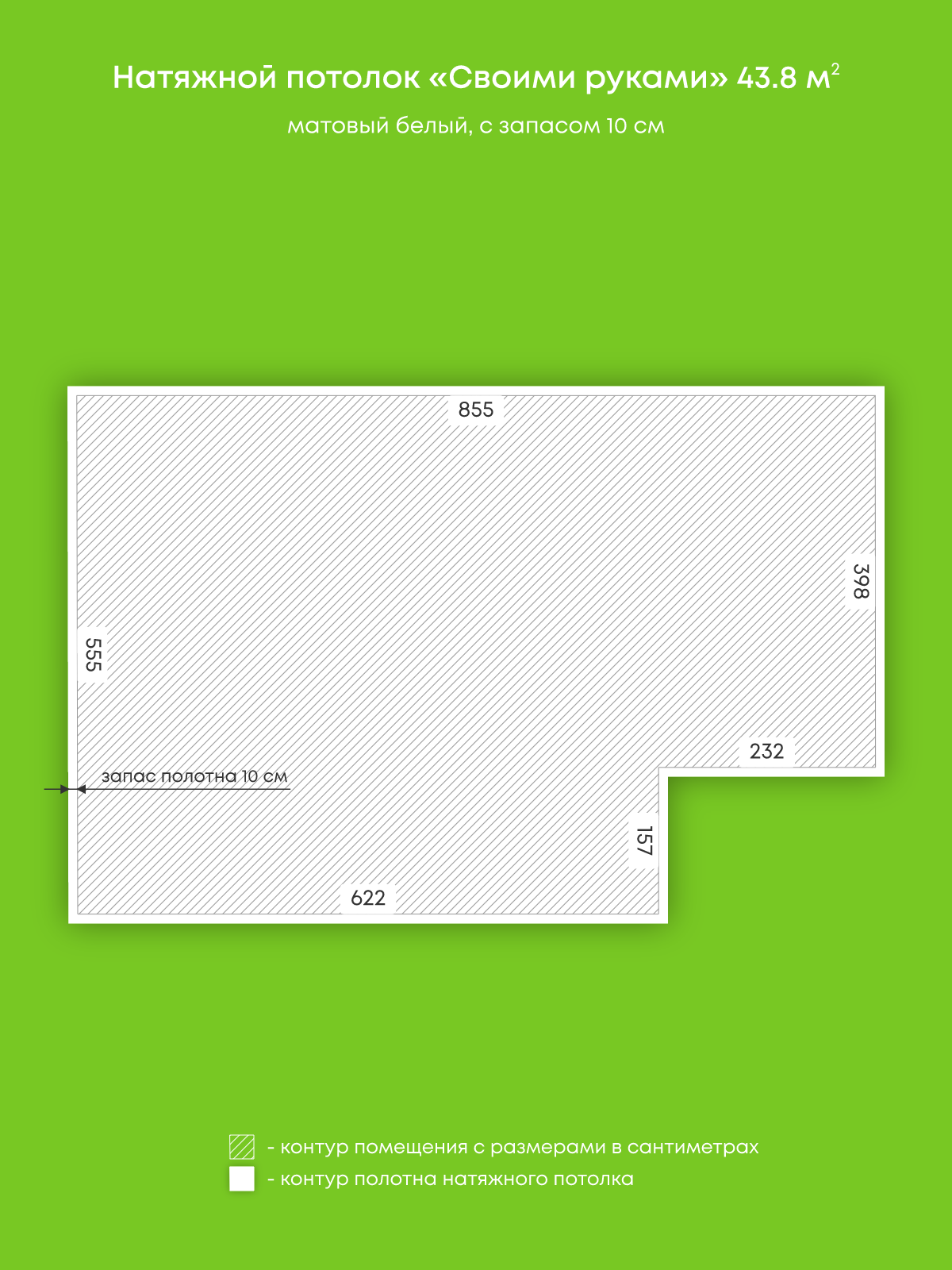 Натяжной потолок белый матовый, изготовленный по индивидуальным размерам покупателя, для гостиной площадью 43.8 м2