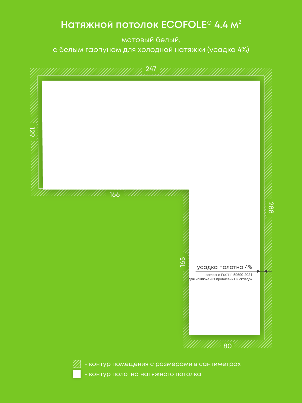 Натяжной потолок белый матовый, изготовленный по индивидуальным размерам покупателя, для помещения площадью 4.4 м2