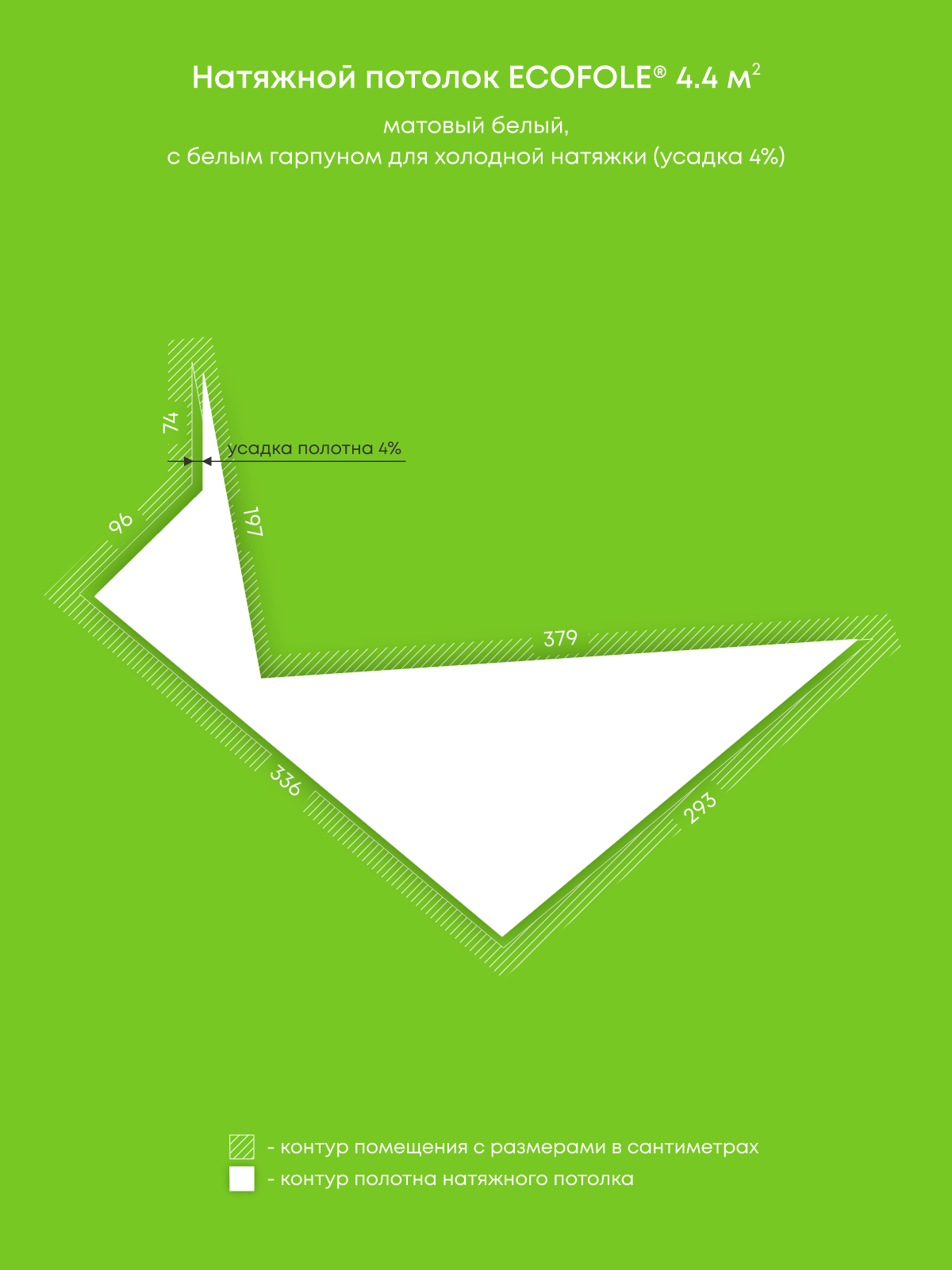 Натяжной потолок белый матовый, изготовленный по индивидуальным размерам покупателя, для спальни площадью 4.4 м2