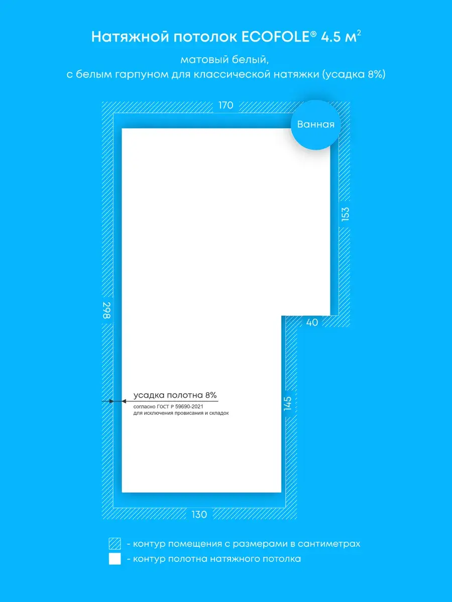 - Технология производства натяжного потолка предусматривает его усадку на 4-9% для исключения провисания после монтажа, т.е. фактический размер готового потолка составляет на 4-9% меньше исходного размера помещения и не является браком;
