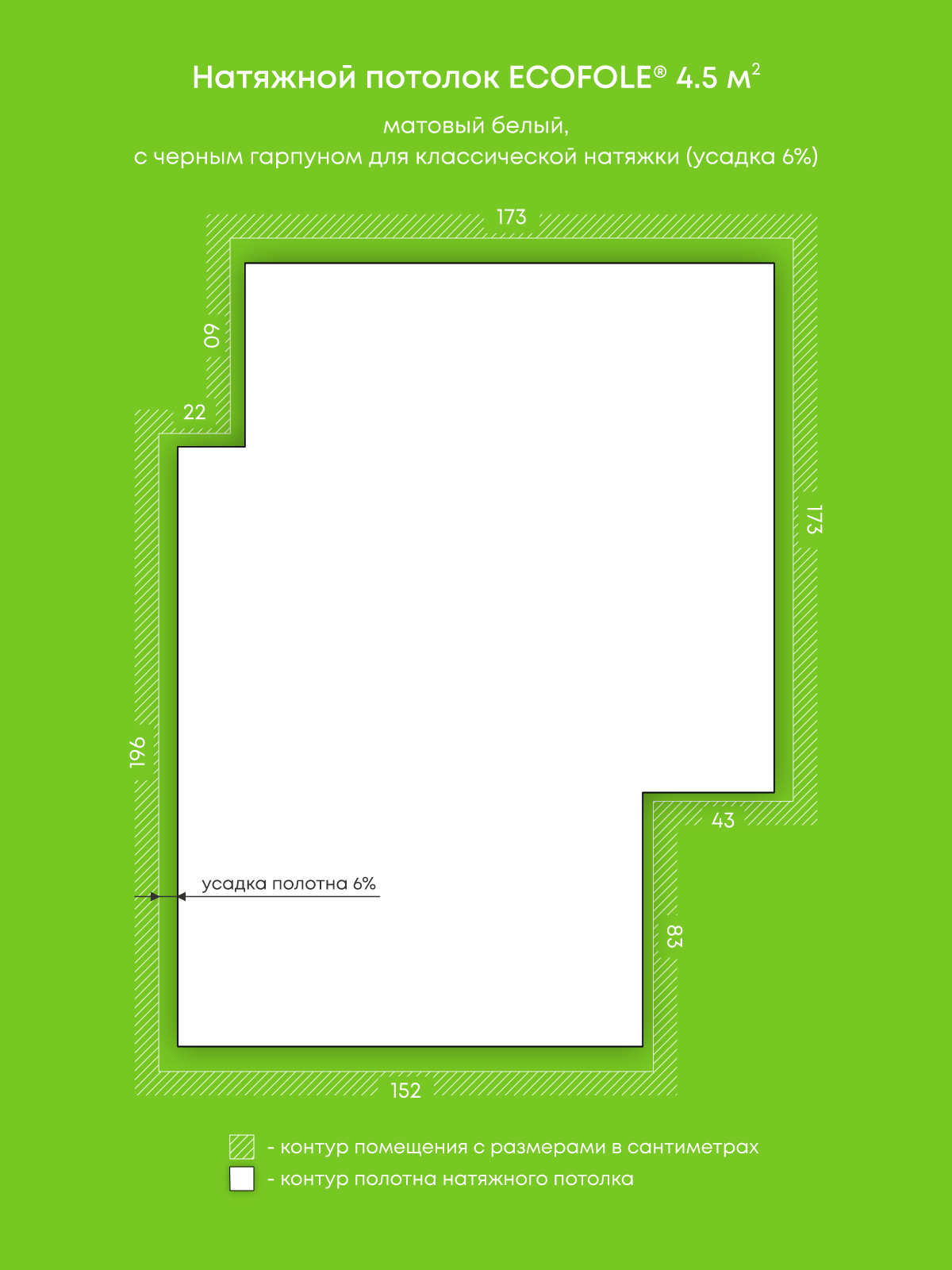 Натяжной потолок белый матовый, изготовленный по индивидуальным размерам покупателя, для помещения площадью 4.5 м2