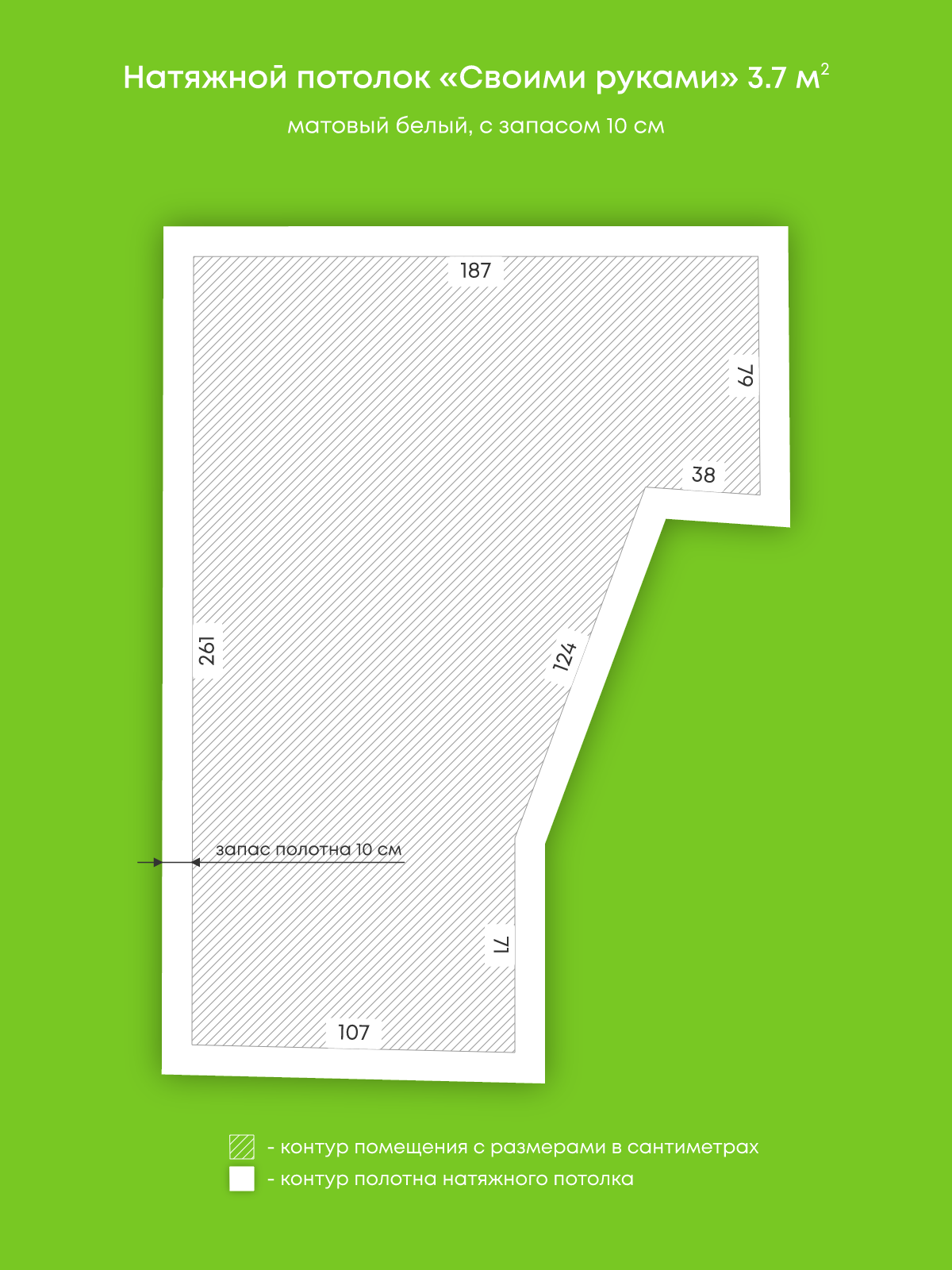 Натяжной потолок белый матовый, изготовленный по индивидуальным размерам покупателя, для помещения площадью 4.6 м2