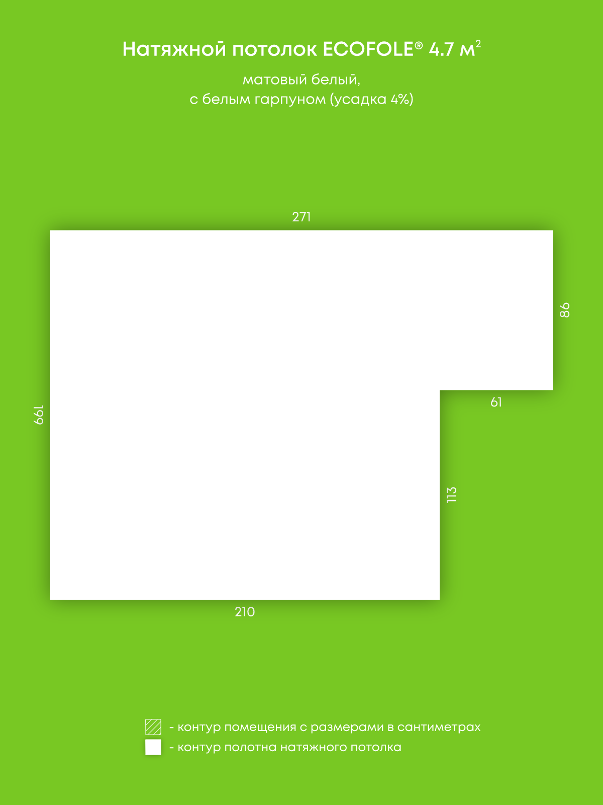 Натяжной потолок белый матовый, изготовленный по индивидуальным размерам покупателя, для помещения площадью 4.7 м2
