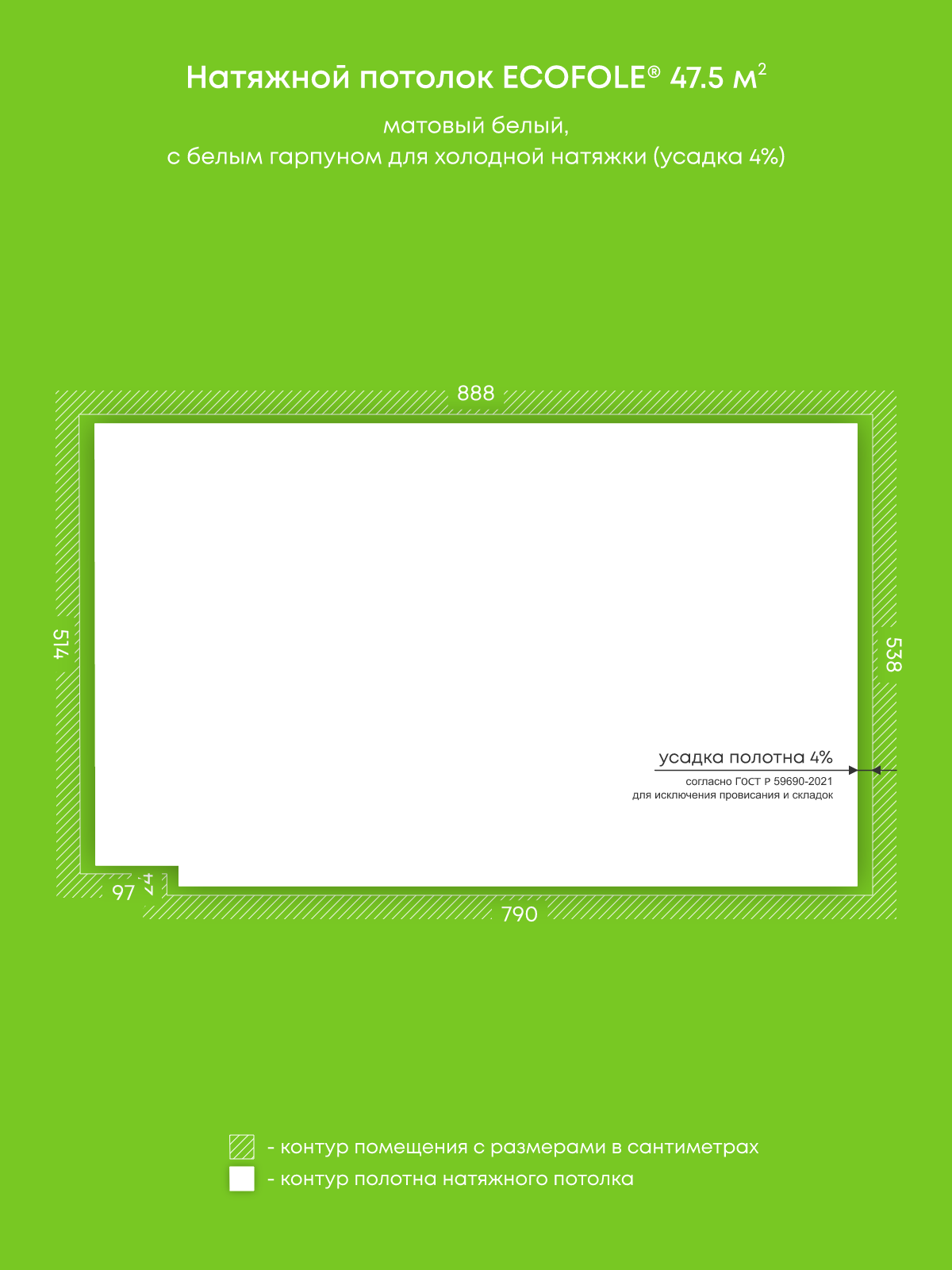 Натяжной потолок белый матовый, изготовленный по индивидуальным размерам покупателя, для гостиной площадью 47.5 м2