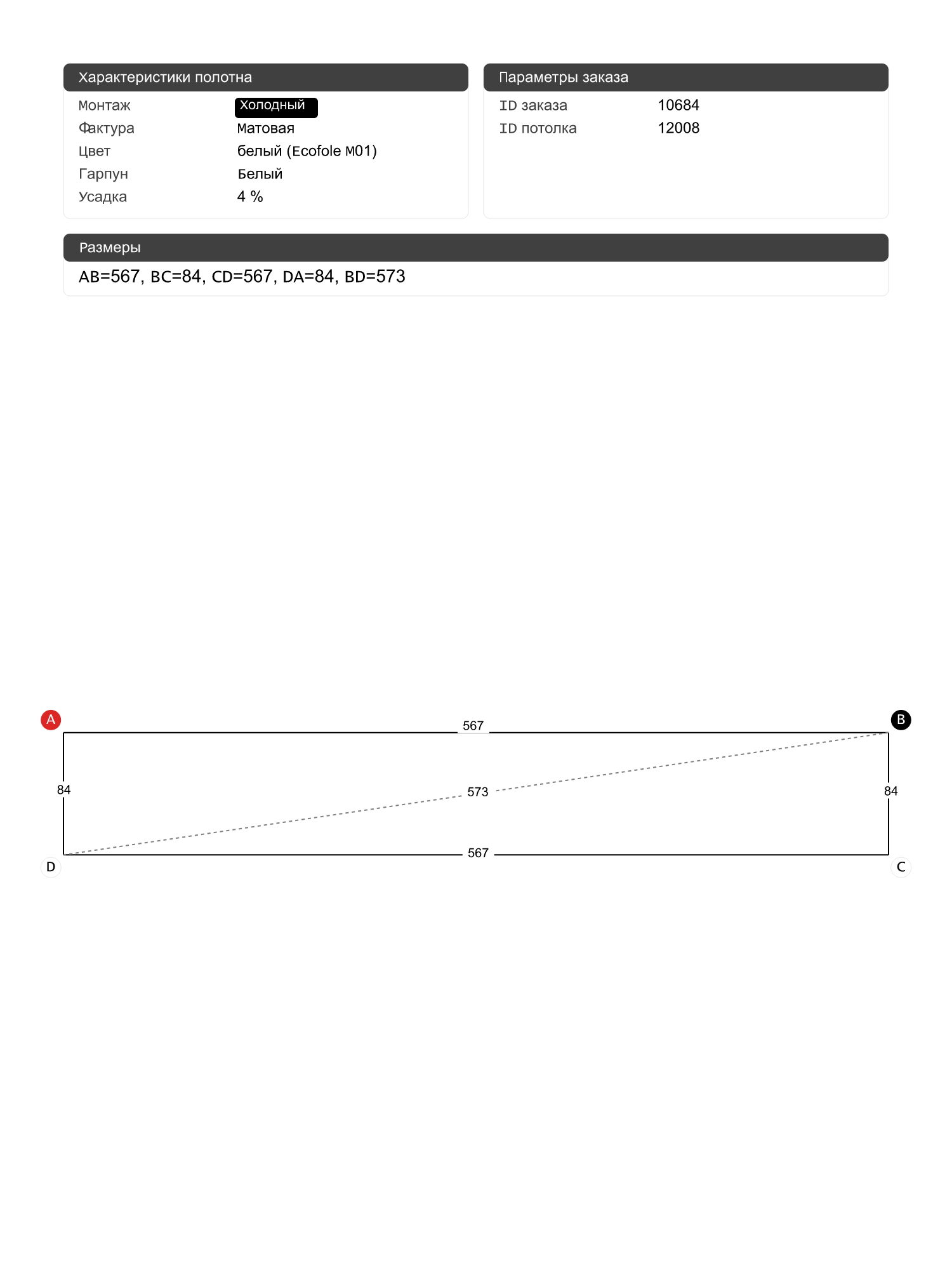 Натяжной потолок белый матовый, холодной натяжки, изготовленный по индивидуальным размерам покупателя, для помещения площадью 4.8 м2