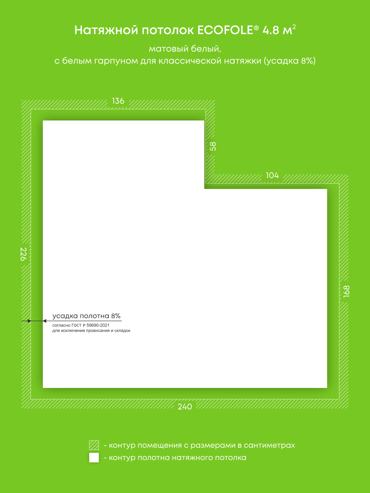 Натяжной потолок белый матовый, изготовленный по индивидуальным размерам покупателя, для помещения площадью 4.8 м2