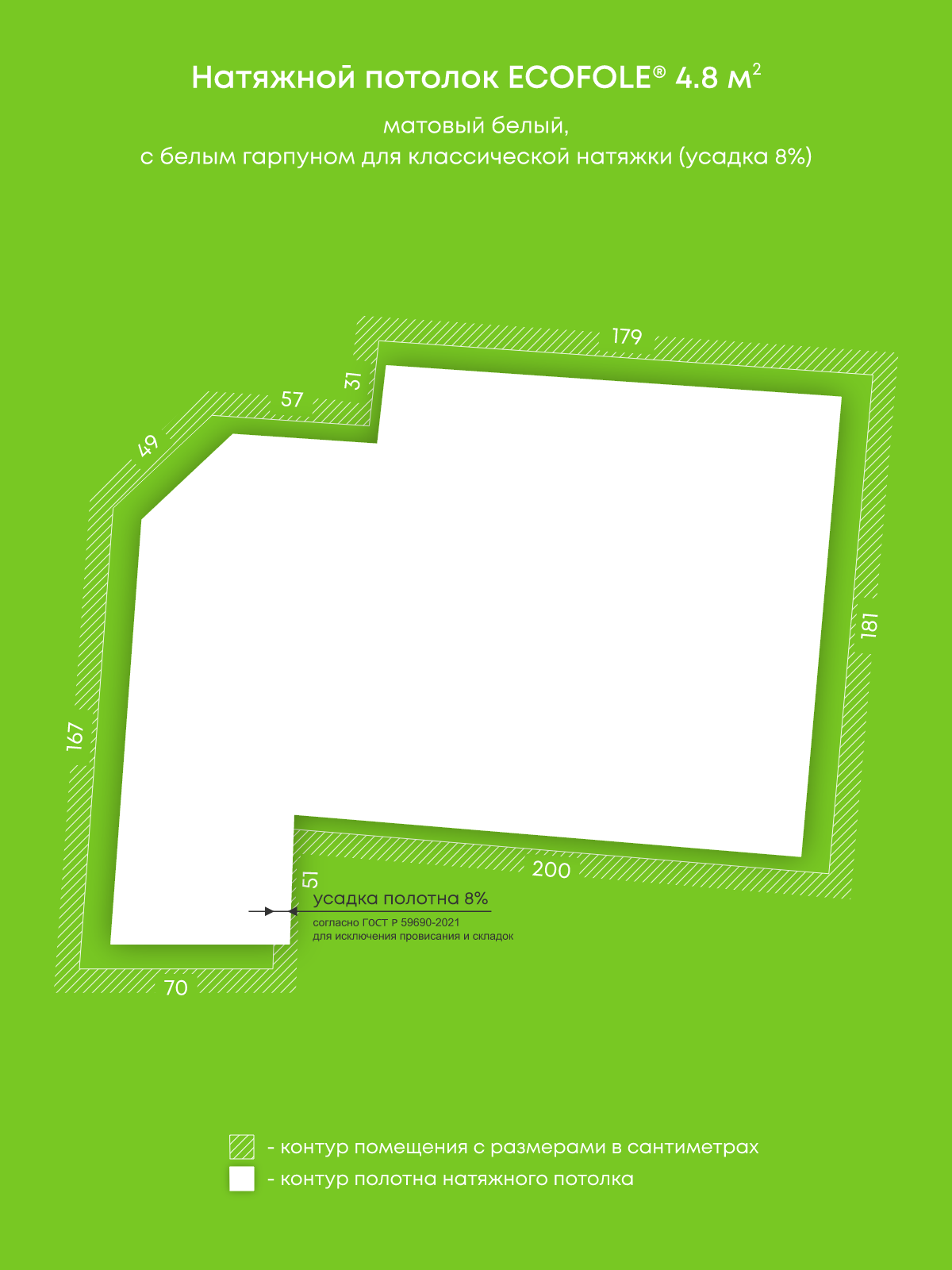 Натяжной потолок белый матовый, изготовленный по индивидуальным размерам покупателя, для ванной площадью 4.8 м2