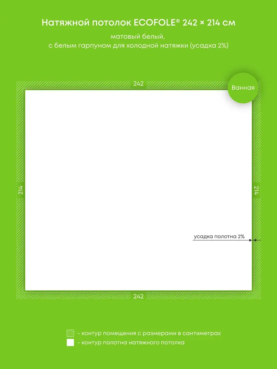- Технология производства натяжного потолка предусматривает его усадку на 4-9% для исключения провисания после монтажа, т.е. фактический размер готового потолка составляет на 4-9% меньше исходного размера помещения и не является браком;