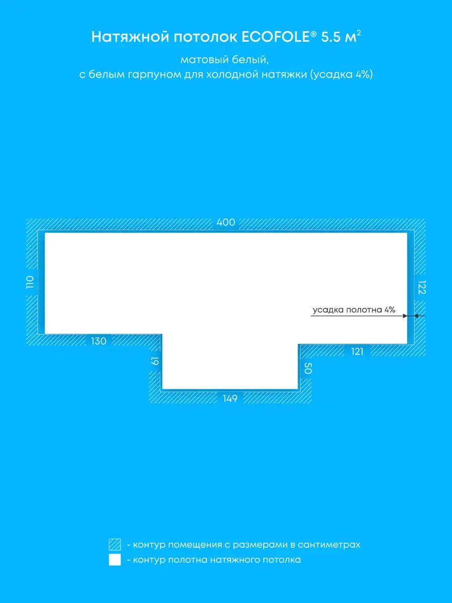 - Технология производства натяжного потолка предусматривает его усадку на 4-9% для исключения провисания после монтажа, т.е. фактический размер готового потолка составляет на 4-9% меньше исходного размера помещения и не является браком;