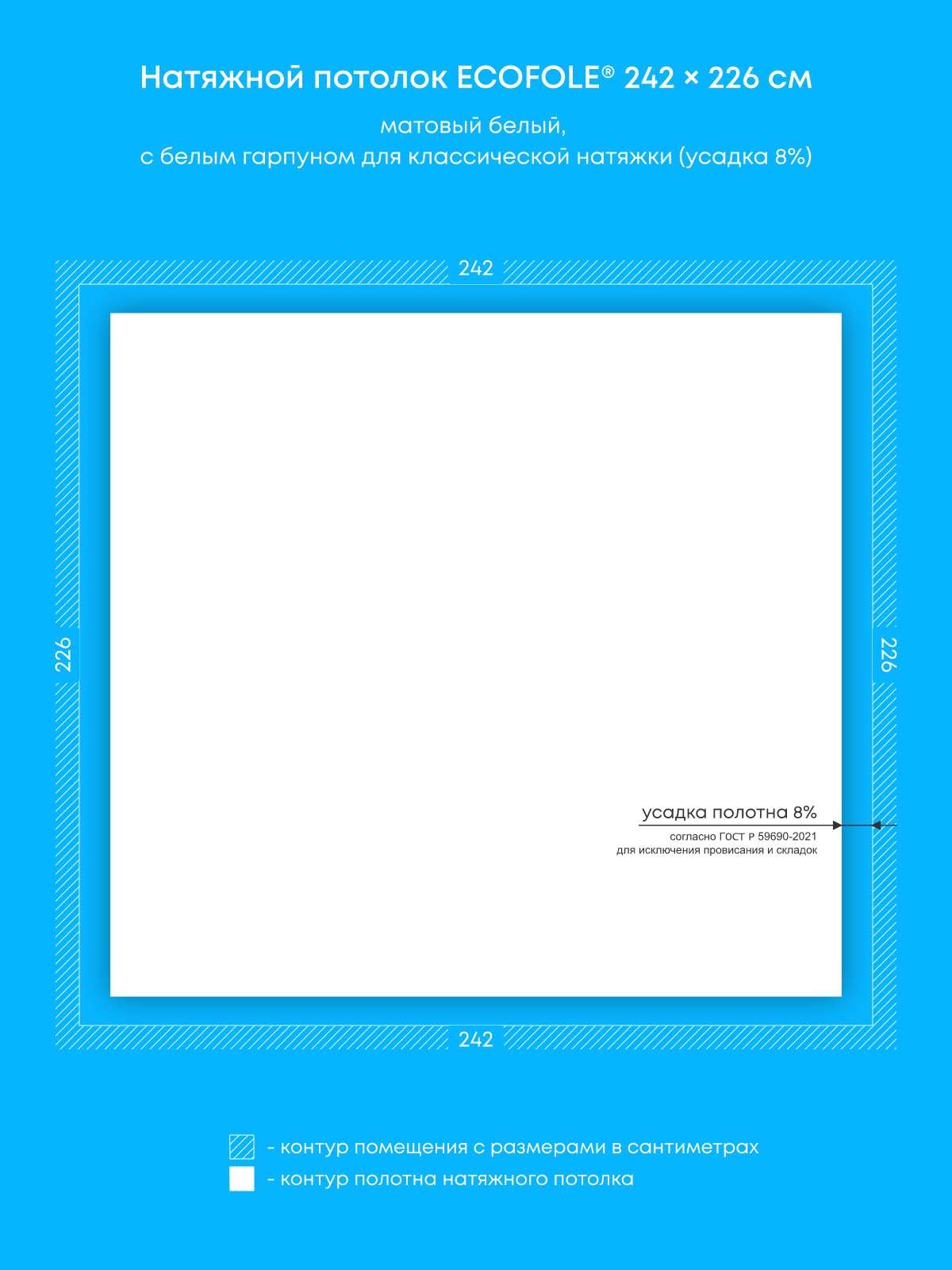 Натяжной потолок белый матовый, классической натяжки, изготовленный по индивидуальным размерам покупателя, для помещения площадью 5.5 м2
