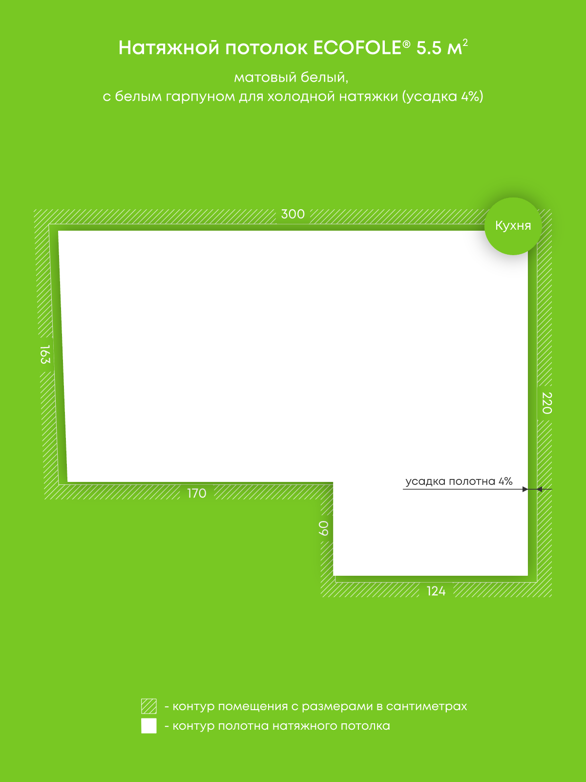 Натяжной потолок белый матовый, изготовленный по индивидуальным размерам покупателя, для кухни площадью 5.5 м2