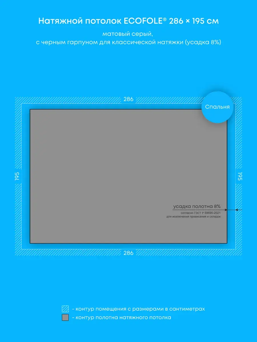 - Технология производства натяжного потолка предусматривает его усадку на 4-9% для исключения провисания после монтажа, т.е. фактический размер готового потолка составляет на 4-9% меньше исходного размера помещения и не является браком;