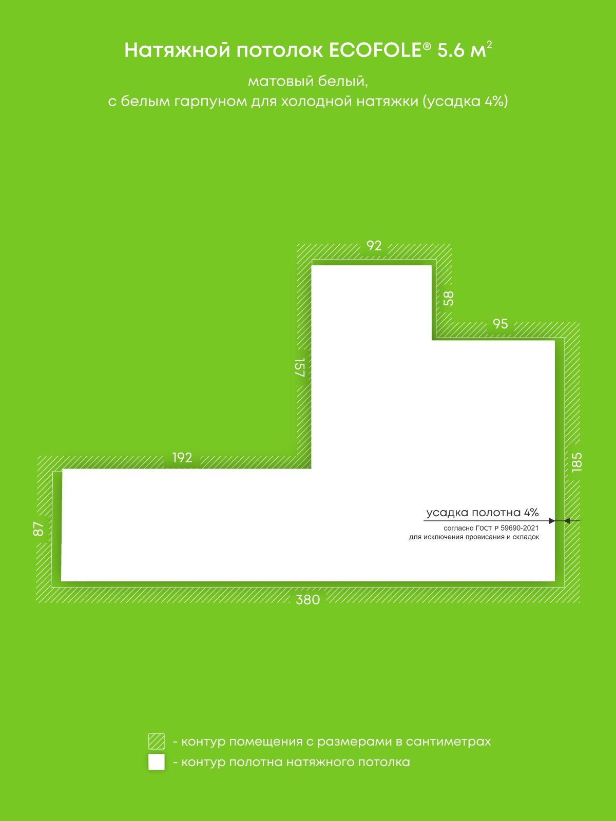 Натяжной потолок белый матовый, изготовленный по индивидуальным размерам покупателя, для помещения площадью 5.6 м2