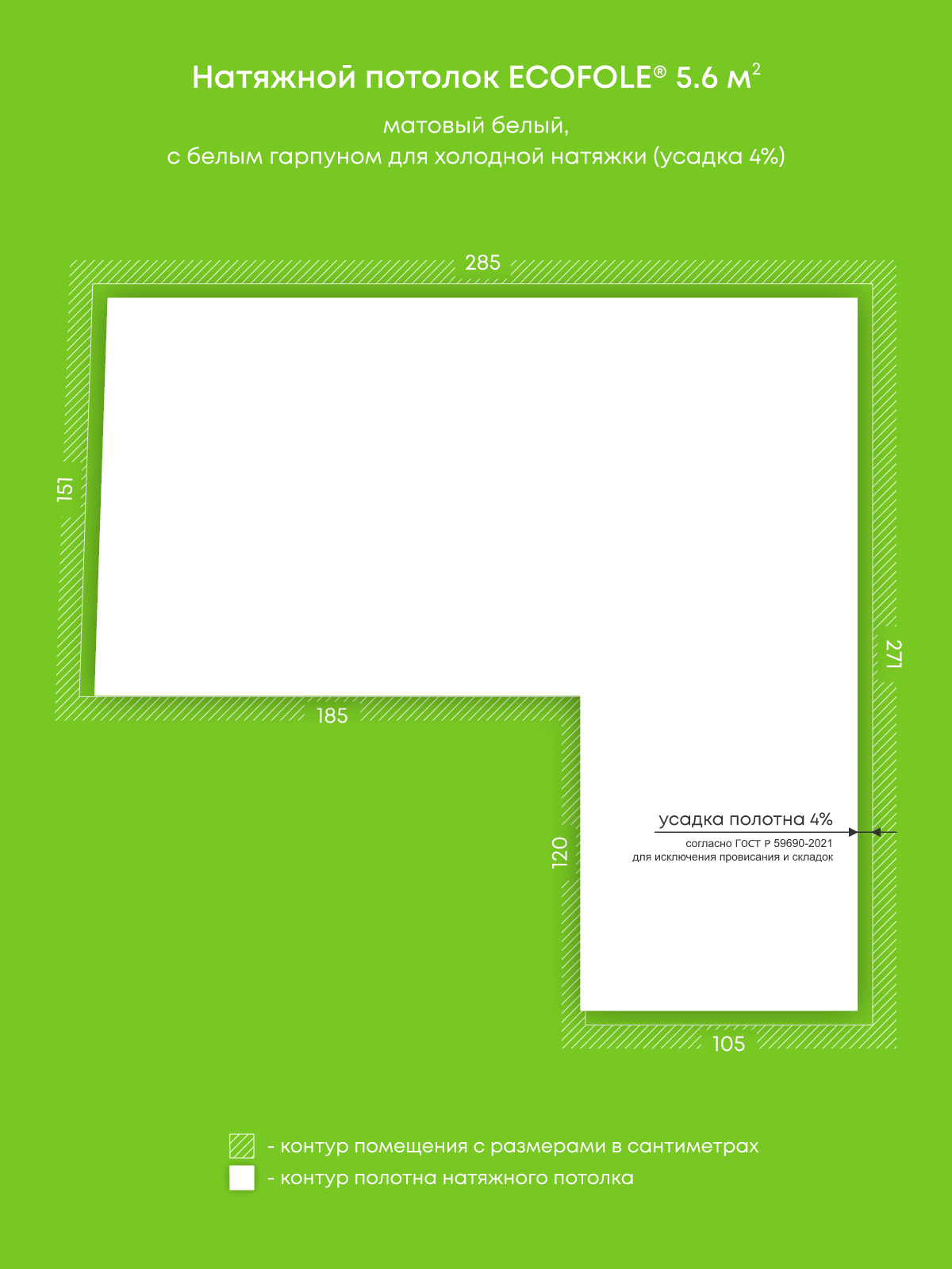 Натяжной потолок белый матовый, изготовленный по индивидуальным размерам покупателя, для помещения площадью 5.6 м2