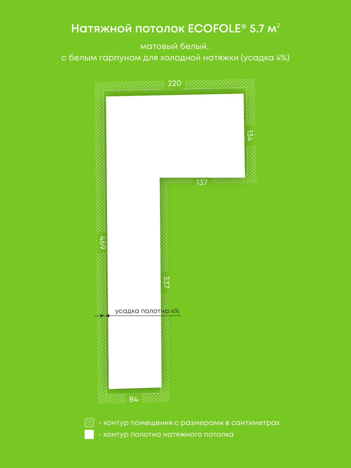 Натяжной потолок белый матовый, изготовленный по индивидуальным размерам покупателя, для помещения площадью 5.7 м2