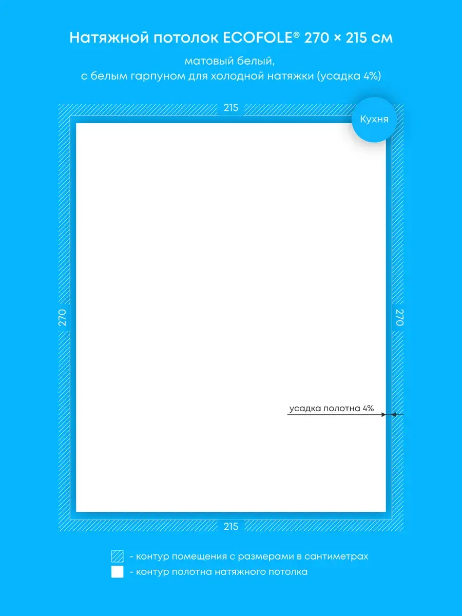 - Технология производства натяжного потолка предусматривает его усадку на 4-9% для исключения провисания после монтажа, т.е. фактический размер готового потолка составляет на 4-9% меньше исходного размера помещения и не является браком;