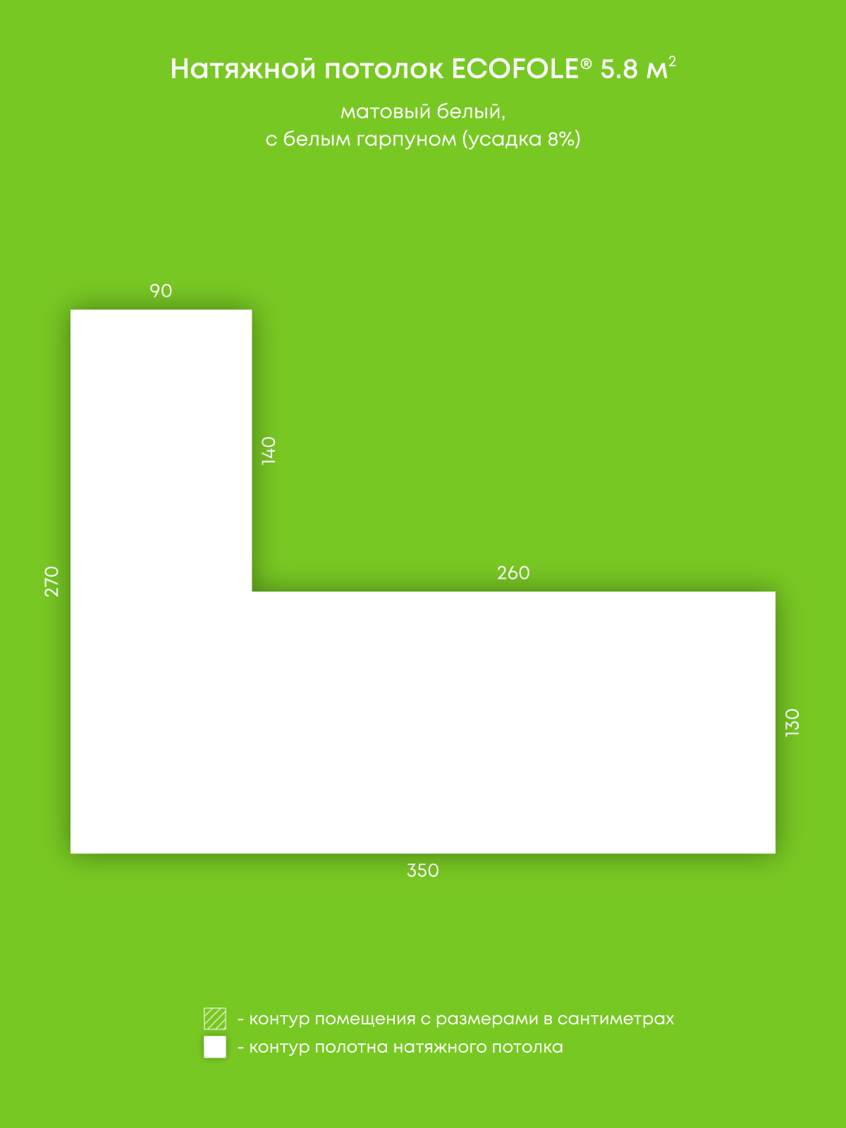 Натяжной потолок белый матовый, изготовленный по индивидуальным размерам покупателя, для помещения площадью 5.8 м2