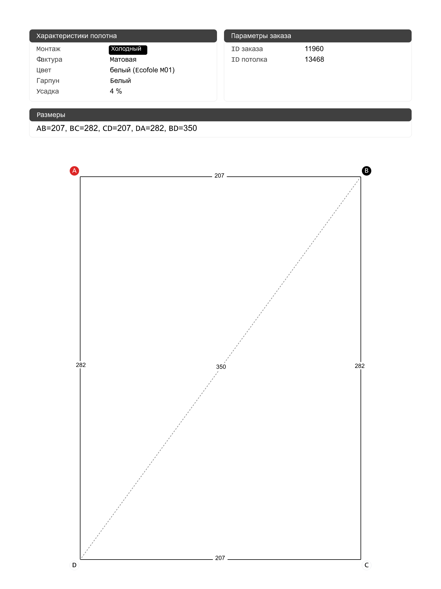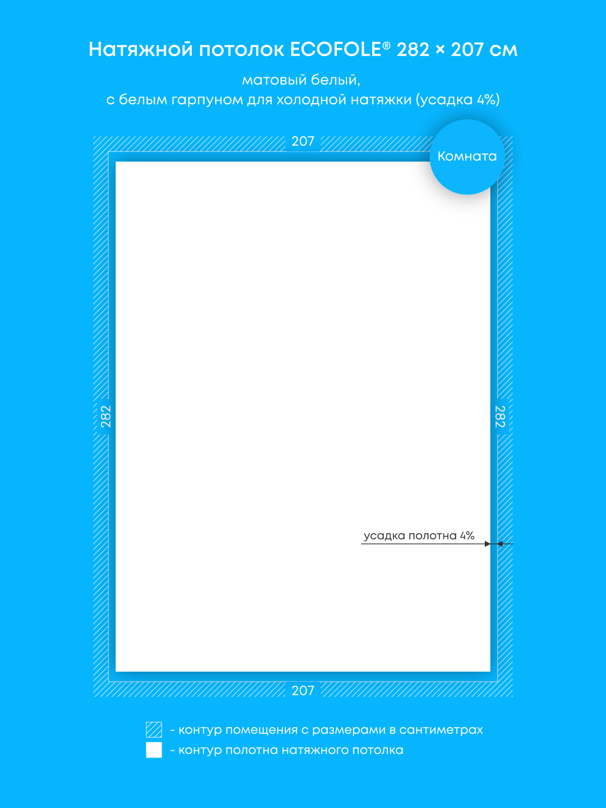 Натяжной потолок белый матовый, холодной натяжки, изготовленный по индивидуальным размерам покупателя, для помещения площадью 5.8 м2