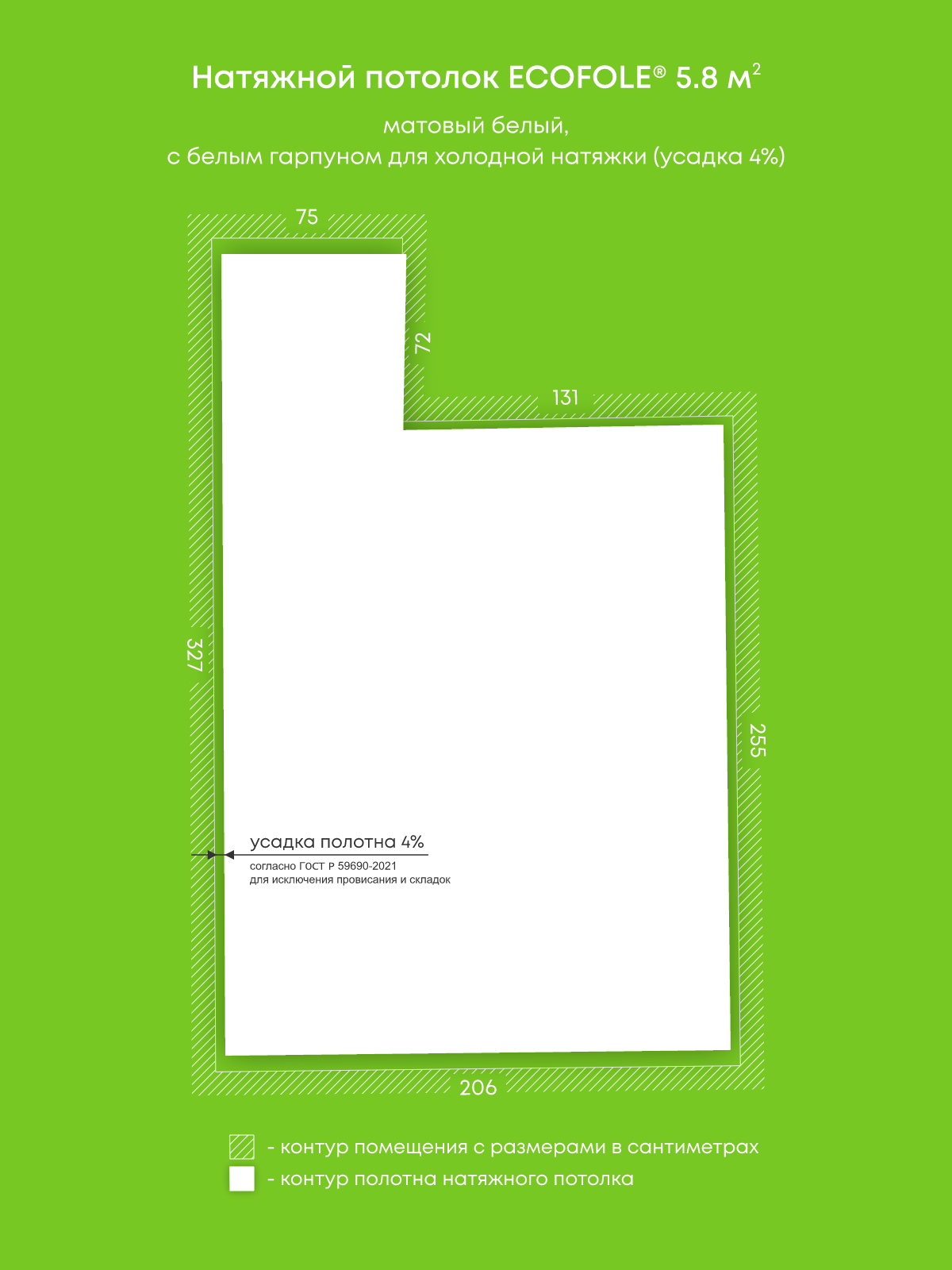 Натяжной потолок белый матовый, изготовленный по индивидуальным размерам покупателя, для ванной площадью 5.8 м2