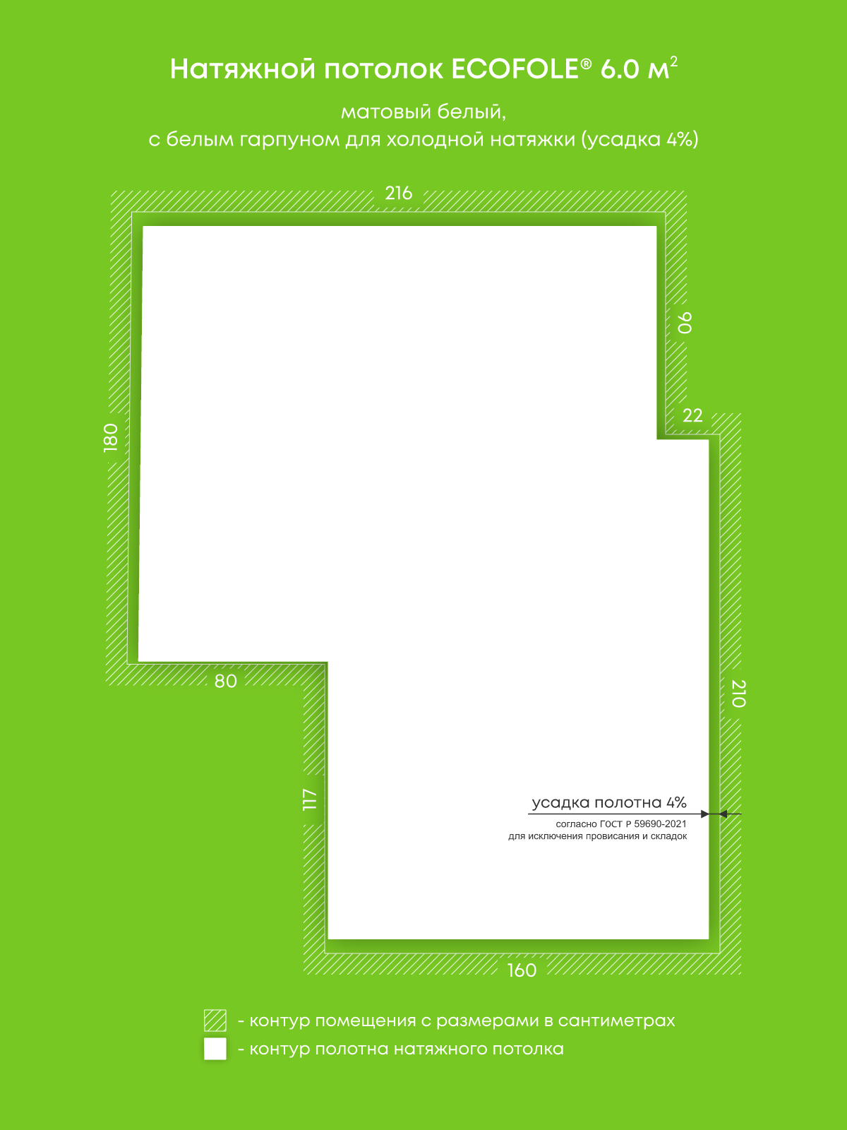 Натяжной потолок белый матовый, изготовленный по индивидуальным размерам покупателя, для помещения площадью 6 м2