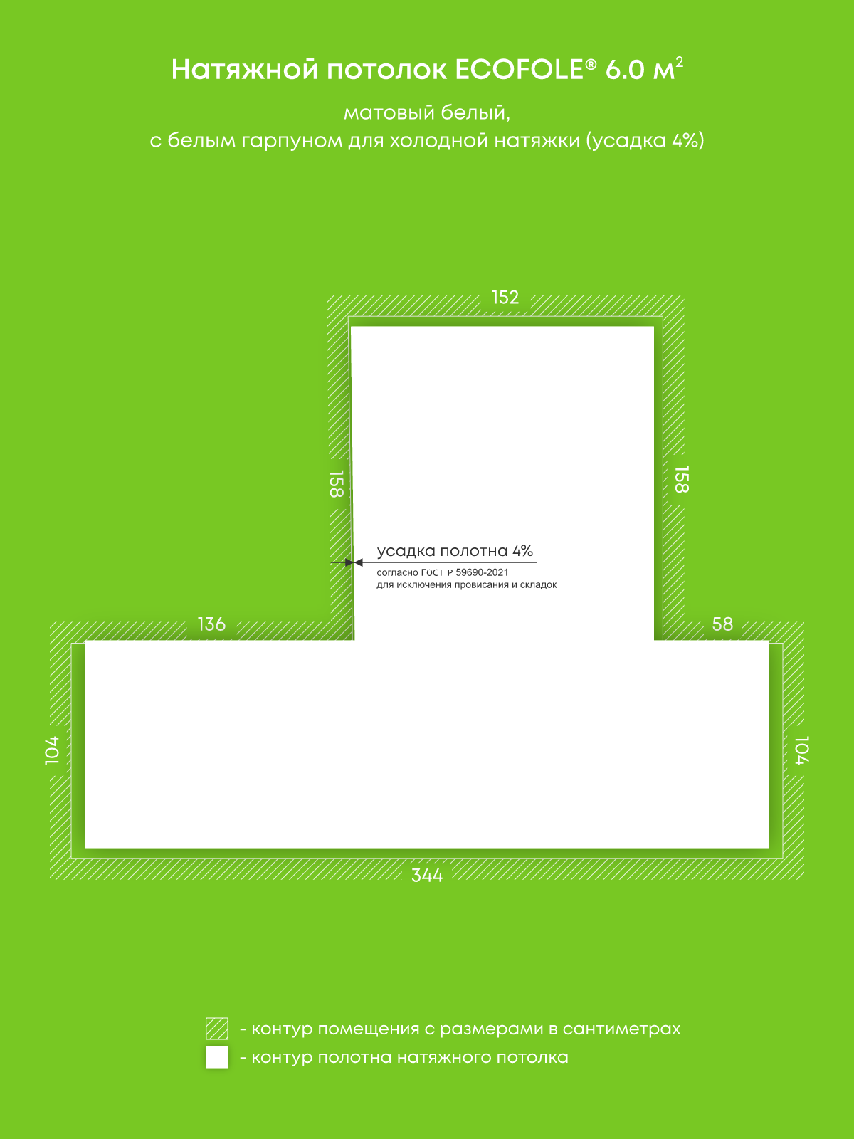Натяжной потолок белый матовый, изготовленный по индивидуальным размерам покупателя, для помещения площадью 6 м2