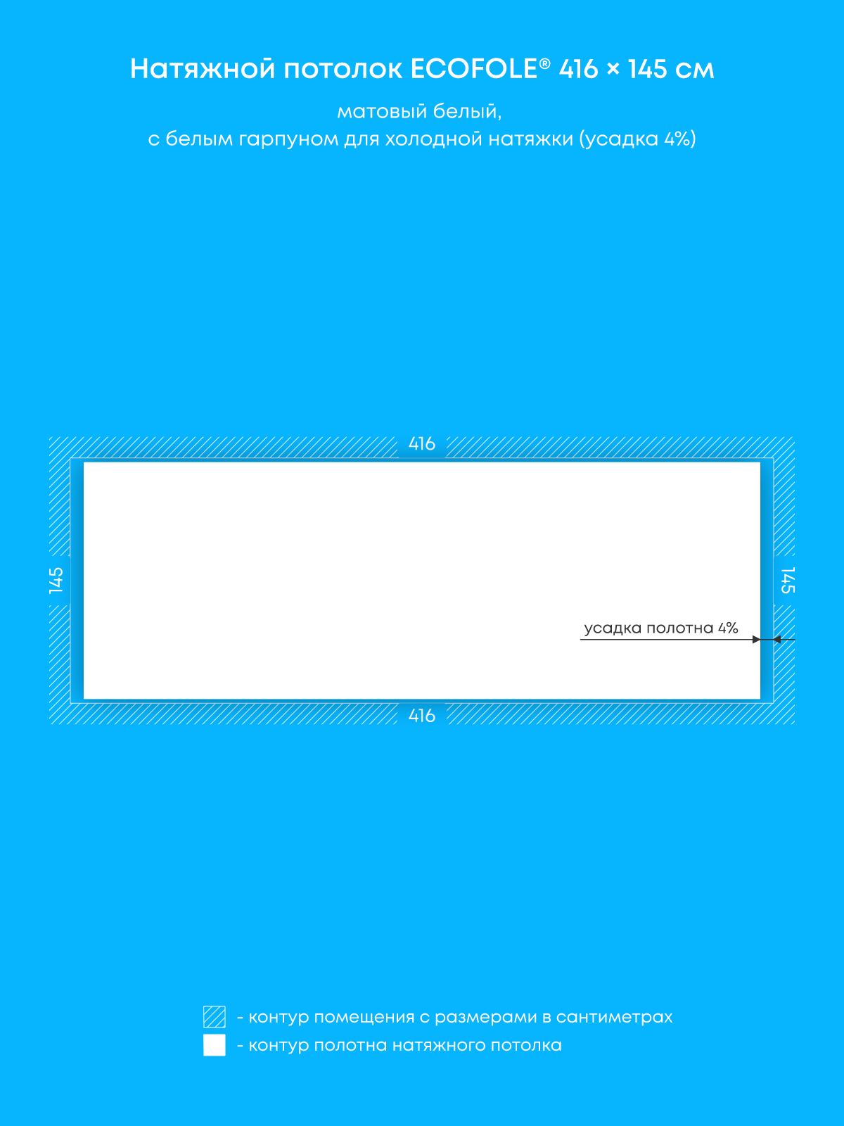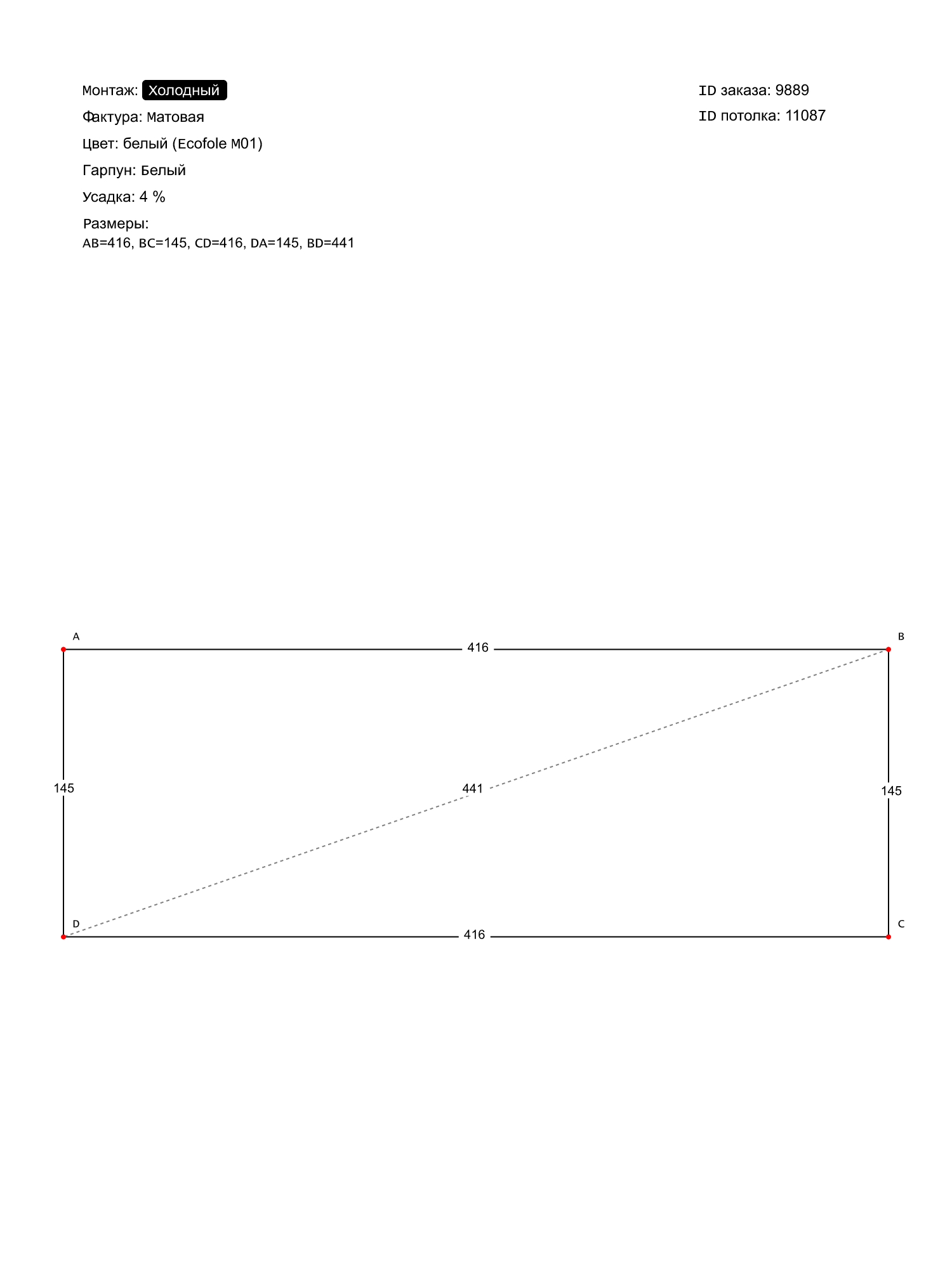 Натяжной потолок белый матовый, холодной натяжки, изготовленный по индивидуальным размерам покупателя, для помещения площадью 6 м2