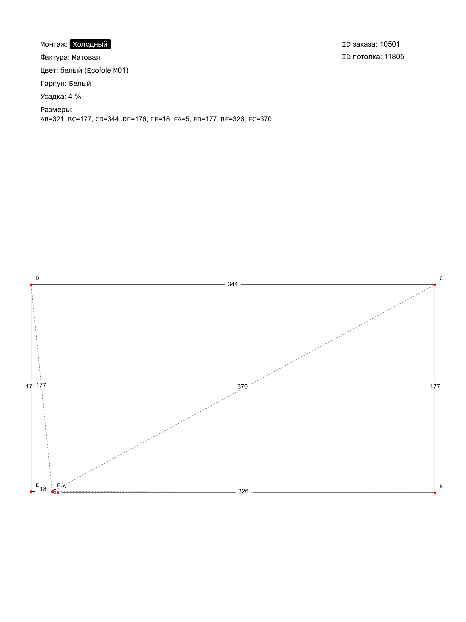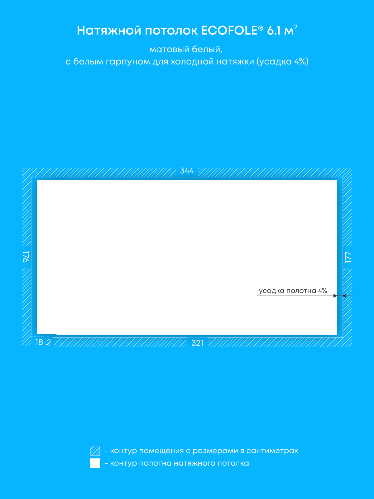 Натяжной потолок белый матовый, холодной натяжки, изготовленный по индивидуальным размерам покупателя, для помещения площадью 6.1 м2