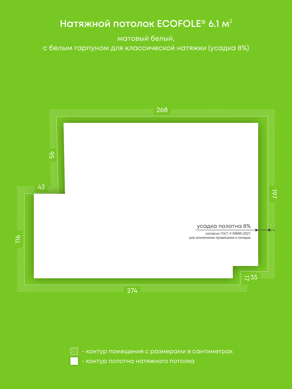 Натяжной потолок белый матовый, изготовленный по индивидуальным размерам покупателя, для ванной площадью 6.1 м2