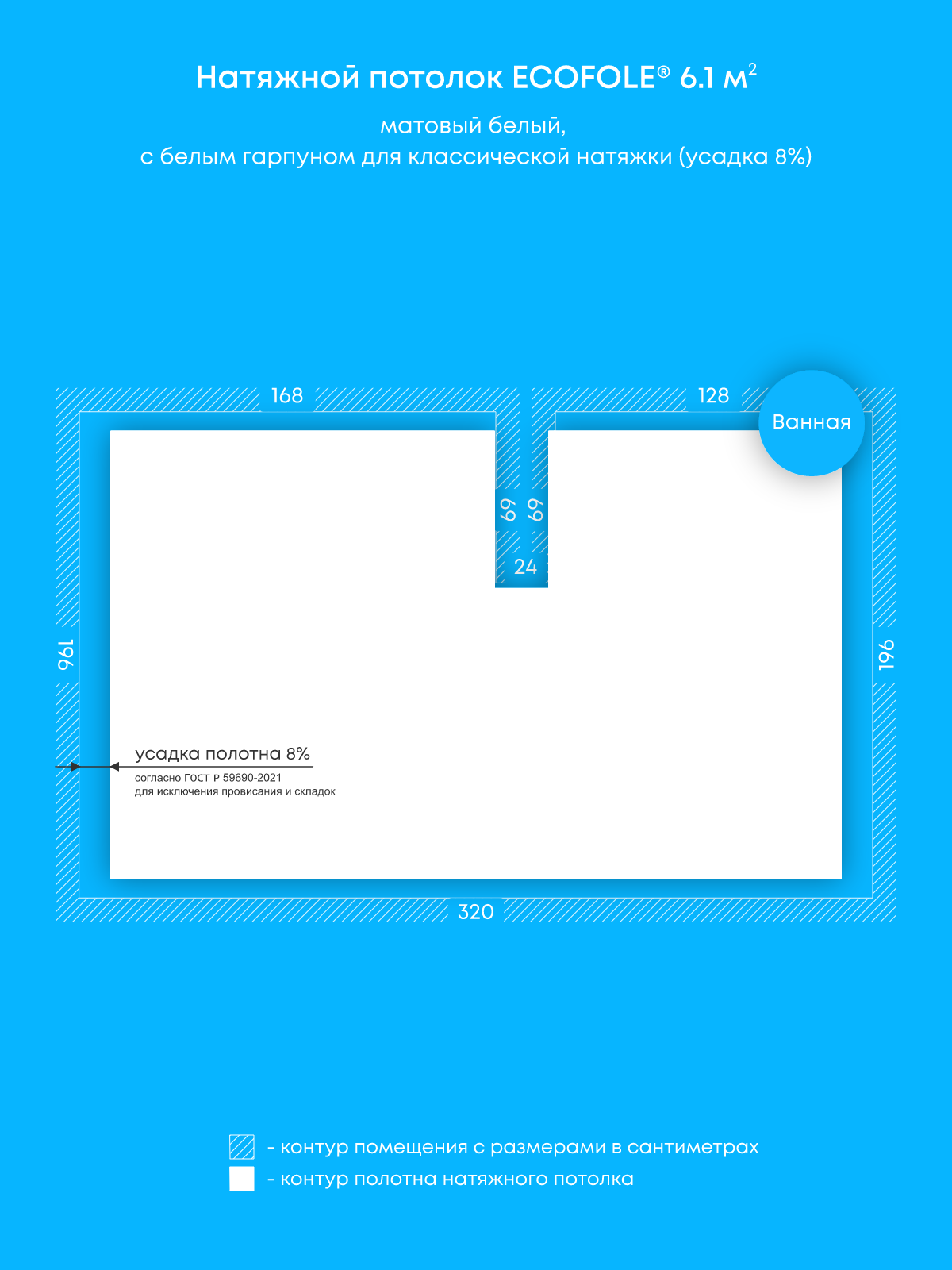 Натяжной потолок белый матовый, изготовленный по индивидуальным размерам покупателя, для ванной площадью 6.1 м2